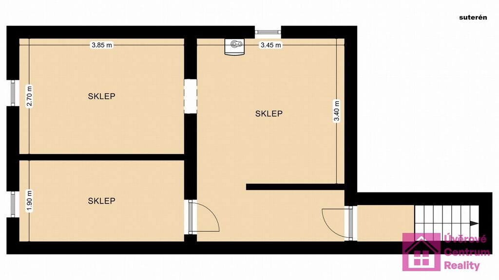 suterén: chodba se schodištěm a tři skladovací prostory,