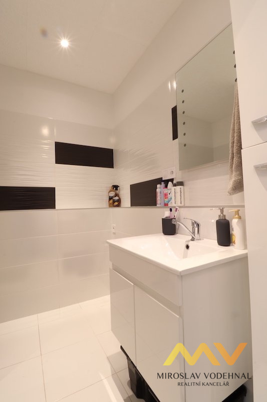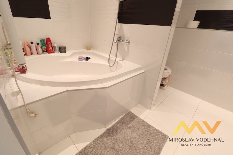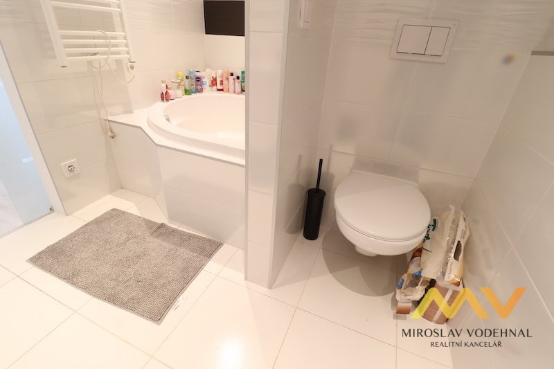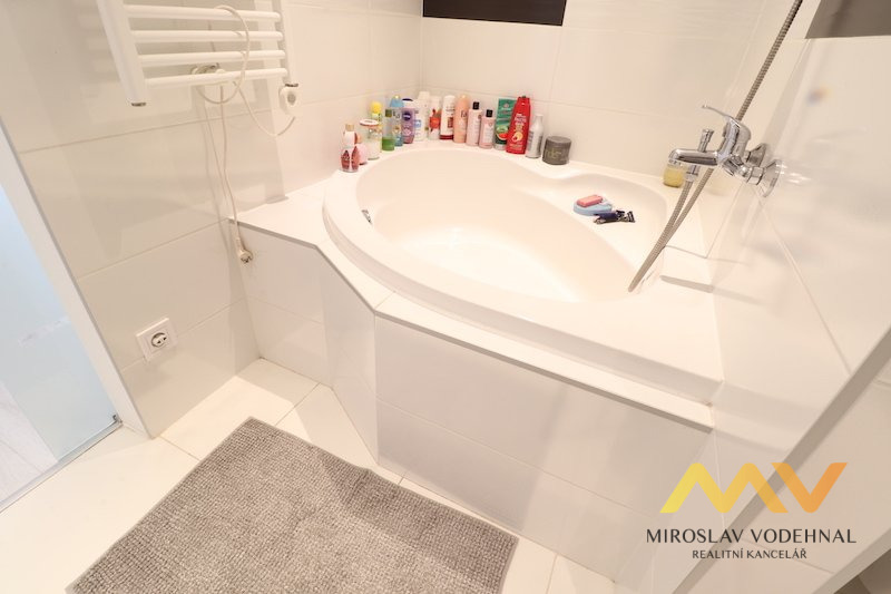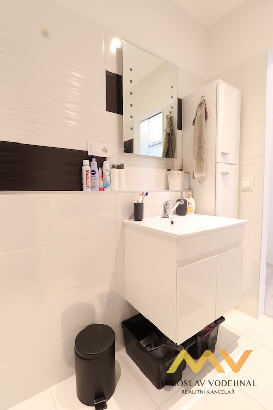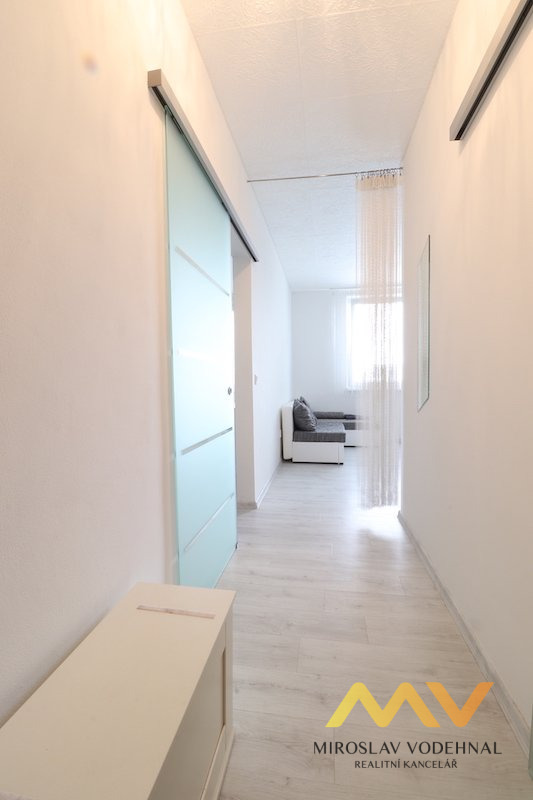V pokoji zůstává pouze velká vestavěná skříň na míru. Koupelna s vanou, koupelnová skříňka s umyvadlem a zrcadlem, toaleta a přípojka na pračku. V bytě designové skleněné zasouvací dveře, všude osvětlení.