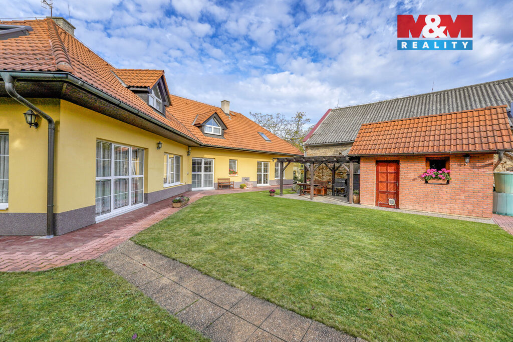 Hledáte místo pro komfortní život celé Vaší rodiny v tom nejvyšším standardu? Máme to pravé. Přinášíme Vám možnost koupi vícegeneračního RD v perfektním stavu s udržovaným pozemkem (887m²), který poskytne dostatek soukromí pro relax i případné zahradničení. Najdete zde majestátní přízemí se salónem, obývacím pokojem s kuchyňským koutem, koupelnu, WC, komoru aj. V horním patře jsou pak samostatné pokoje, v nádherném designu. Další možnosti využití má samostatná část domu (s vlastním vchodem, kde najdeme hlavní pokoj, vedlejší místnost, koupelnu s WC), což může být využito buď pro část rodiny nebo klidně pro své podnikání (ordinace, kancelář, apod.). Dále zde samozřejmě je i zázemí pro Vaše hobby ve formě zahradního domku. Nemovitost je vytápěna plynovými kotli, částečně podlahovým topením, ohřev vody bojlery. Je samozřejmě napojena na vodovod (pro užitkovou vodu jsou zde také dvě studny) a na kanalizaci. Centrum klidné obce s krátkým dojezdem do Prahy