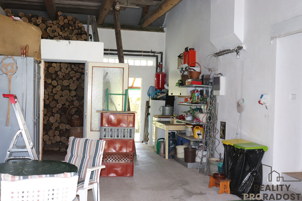 Součástí domu je sklep se studnou, dílna se zásobníkem na vodu a také stodola, která slouží jako garáž a skladovací prostor pro dřevo.