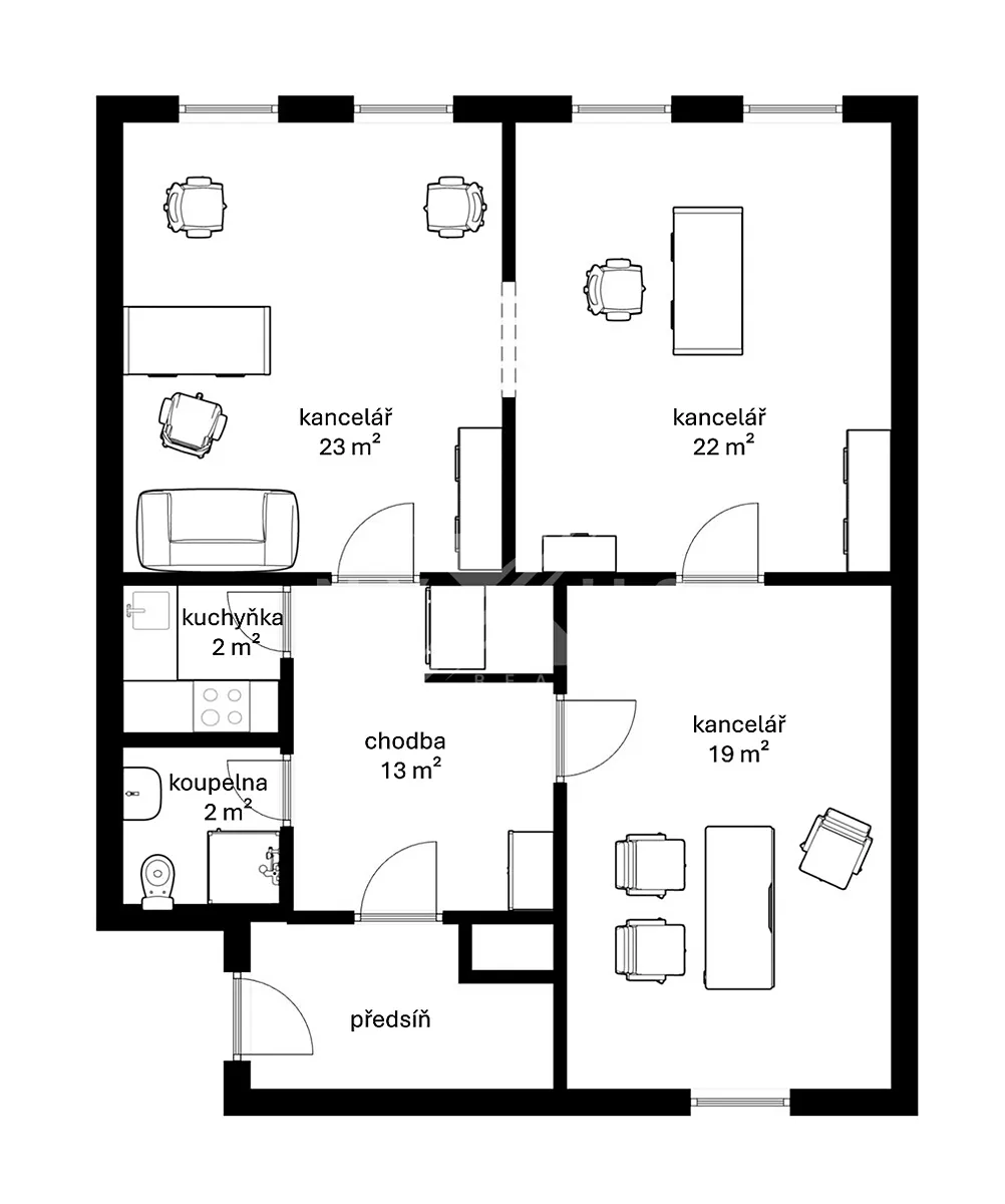 Prostor se skládá ze 3 samostatných místností, kuchyně a sociálního zázemí (toaleta a sprchový kout). Velká okna zajišťují dostatek denního světla, což je u nebytových prostor v přízemí velkou výhodou.