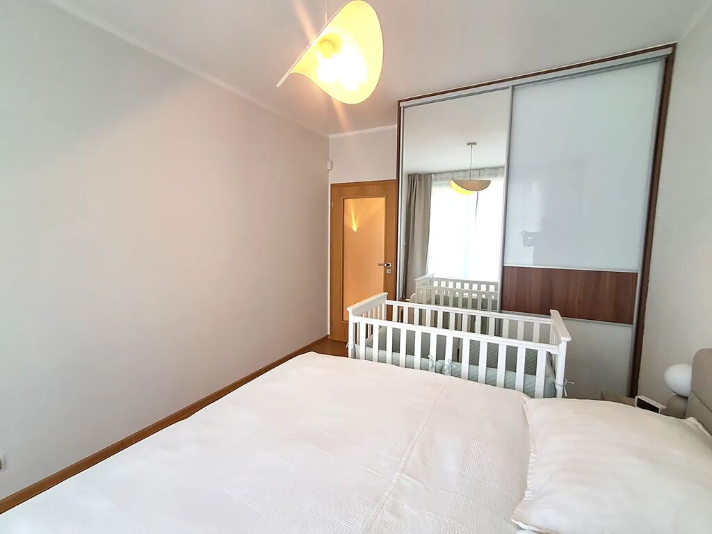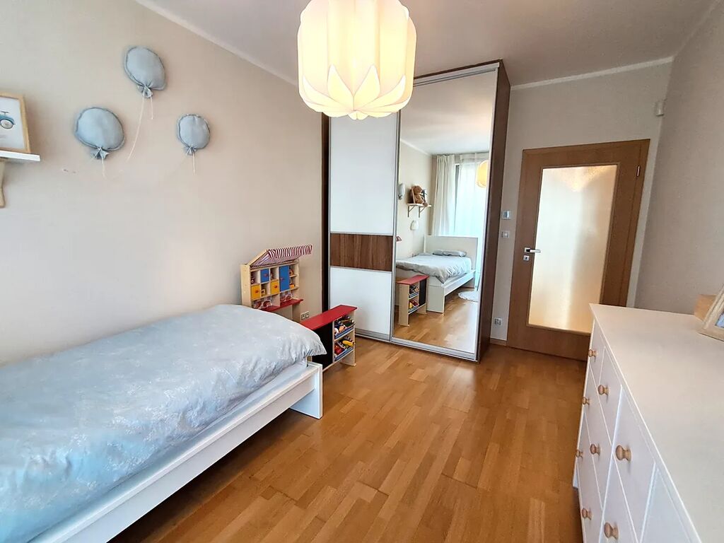 Bytová jednotka sestává z předsíně, dvou ložnic, ze kterých je vstup na balkon, dále obývacího pokoje s plně vybaveným kuchyňským koutem, pracovny-zimní zahrady, samostatného WC, koupelny s vanou a šatny. Vyjma parkovacího stání a parkovacího boxu k bytu náleží skladovací prostor o výměře 4 m2.