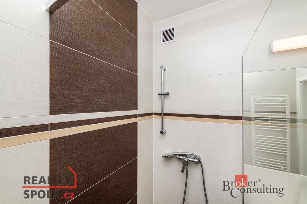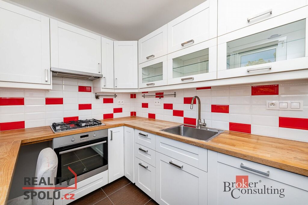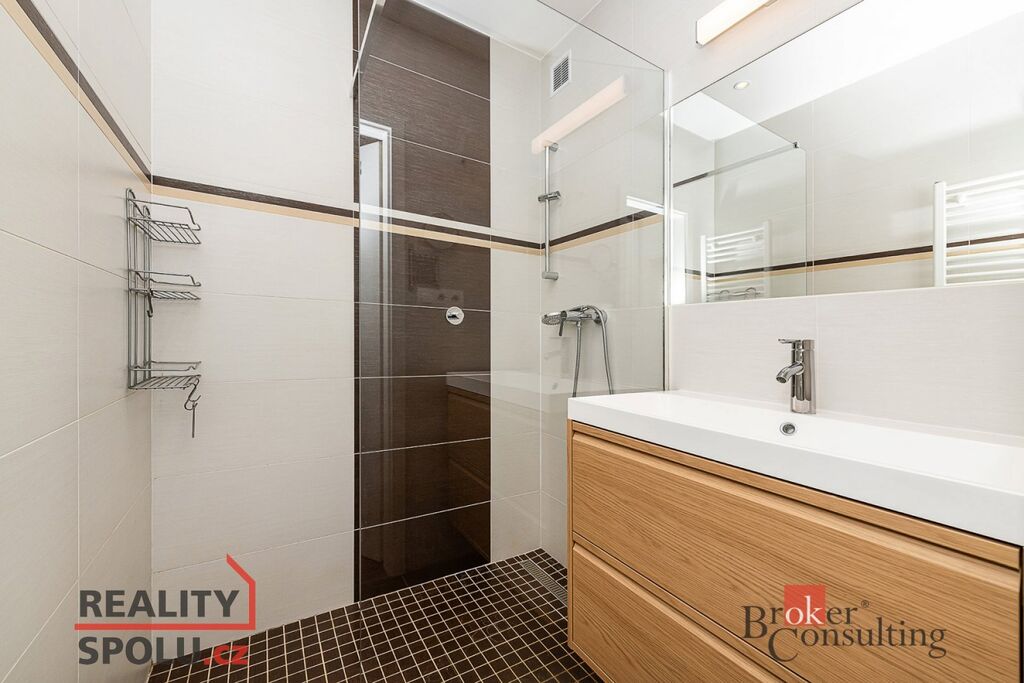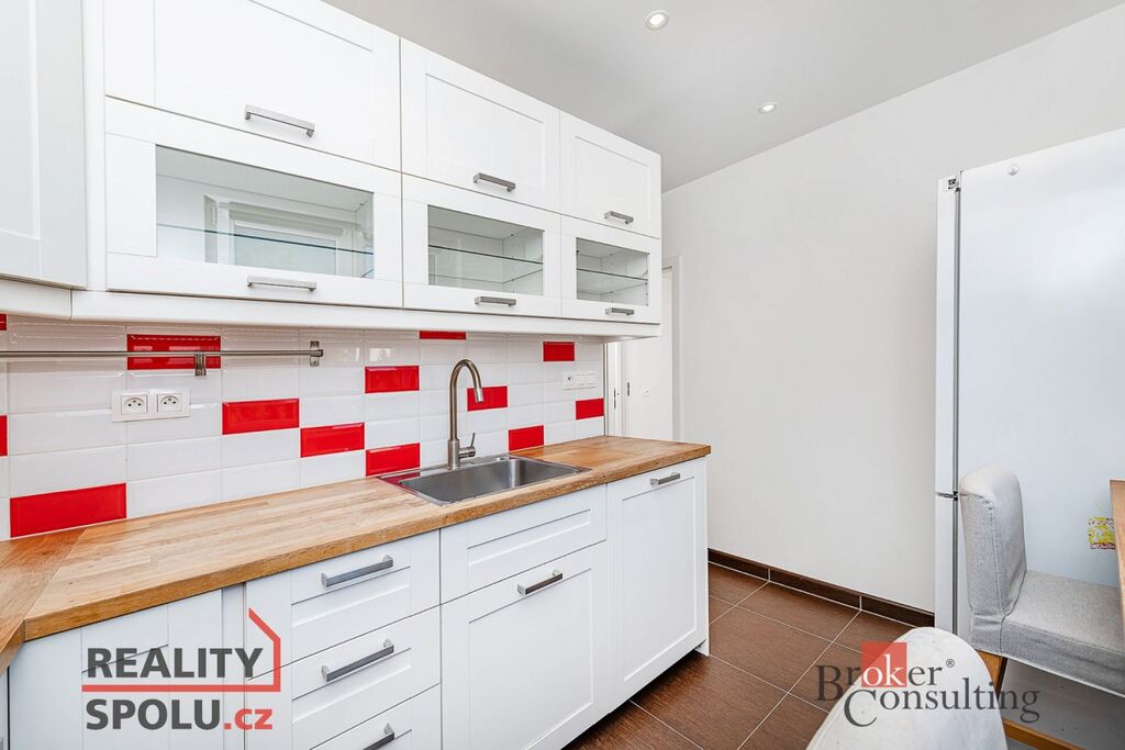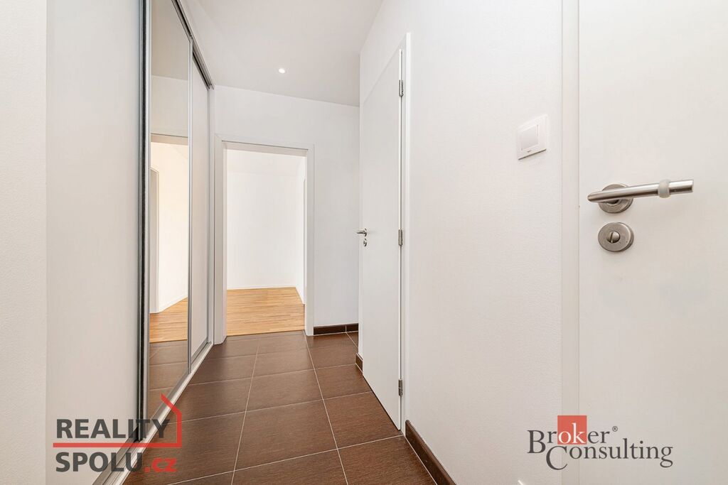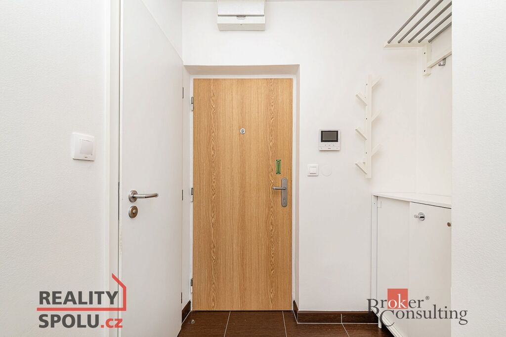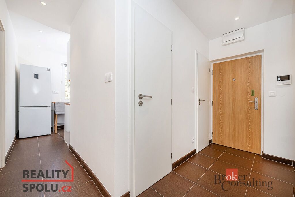 Byt se pronajímá nezařízený, ale v kuchyni je lednice, myčka a plynový sporák. V předsíni zůstává botník a praktické vestavěné skříně, výhodou je komunikační systém s kamerou u vstupních dveří do domu– včetně možnosti ovládání přes internet pomocí aplikace.