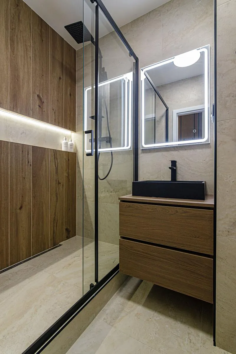 - Koupelna se sprchovým koutem, novými obklady, umyvadlem se skříňkou, podsvíceným zrcadlem a moderními bateriemi