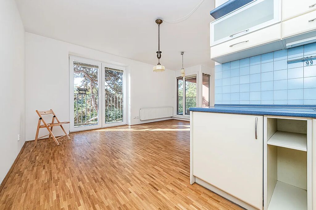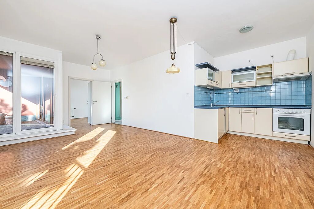Přehledná dispozice bytu zahrnuje prostorný obývací pokoj s kuchyňskou linkou, vstupem na terasu, samostatnou ložnici, vstupní chodbu s vestavěnou skříní a koupelnu s toaletou.