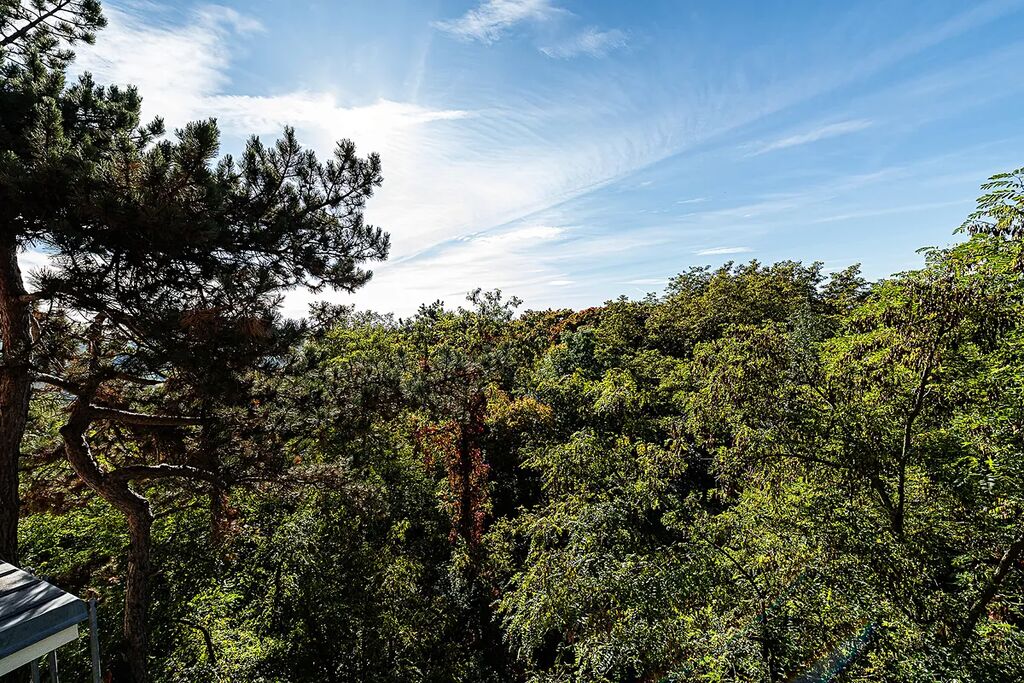 Výhled ze všech oken bytu dále pokračuje do vzrostlých korun borovic a akátů – v průběhu měnících se ročních období je tento výhled až spektakulární.