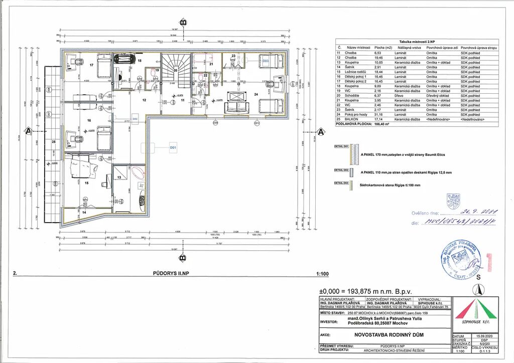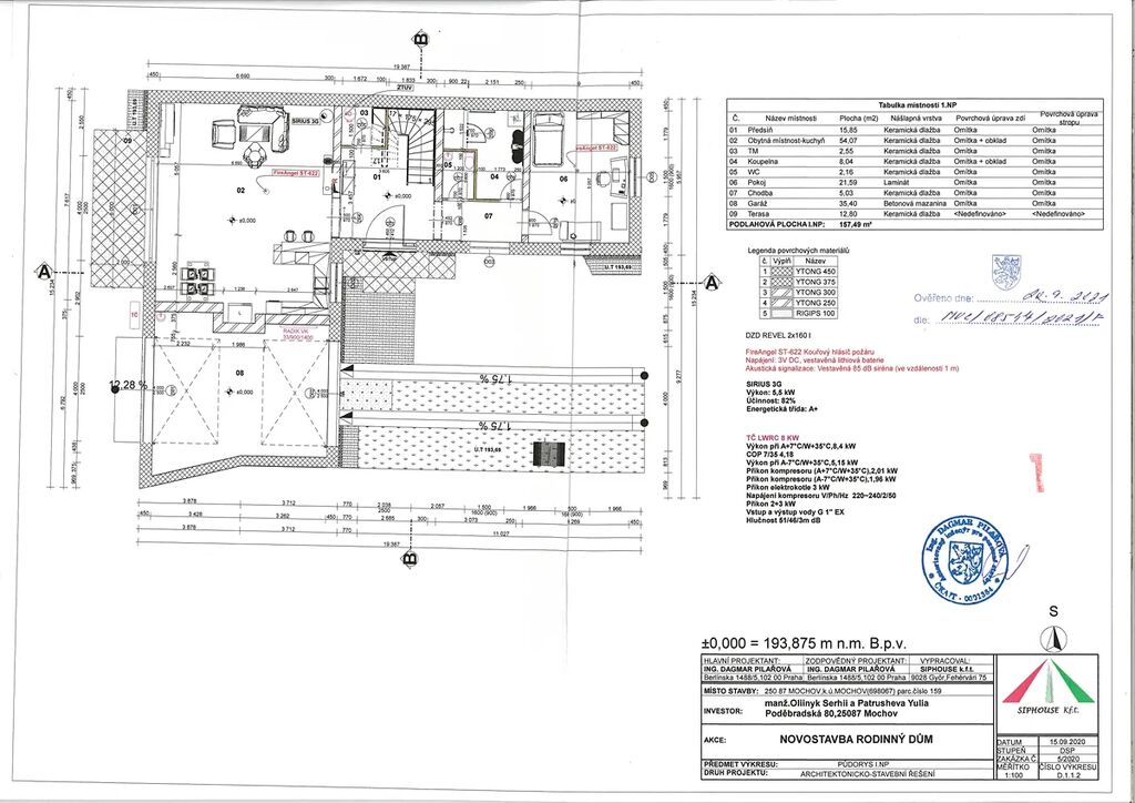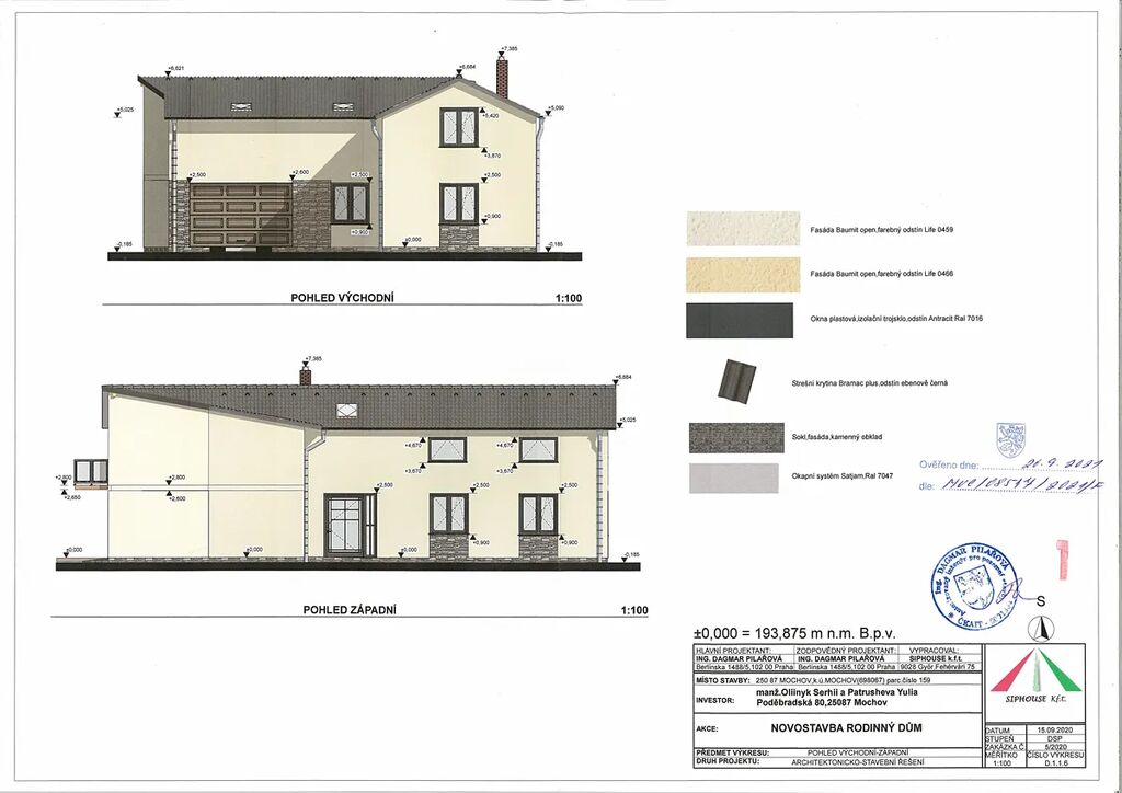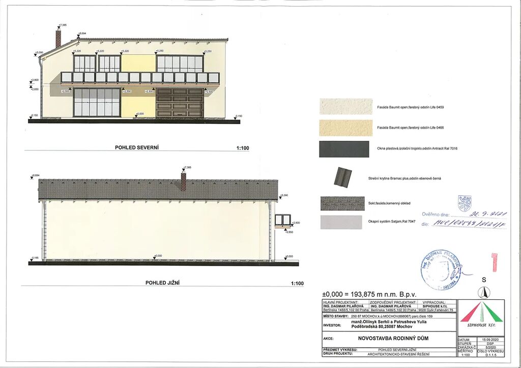 Stavba má platné stavení povolení, a to pro velkou zastavěnou plochu 175 m2. Celková plánovaná užitná plocha stavby je 324 m2, tj. 157,5 m2 v 1 NP a 166,4 m2 v 2 NP (včetně balkónů 12,8 m2 a garáže 35,4 m2).