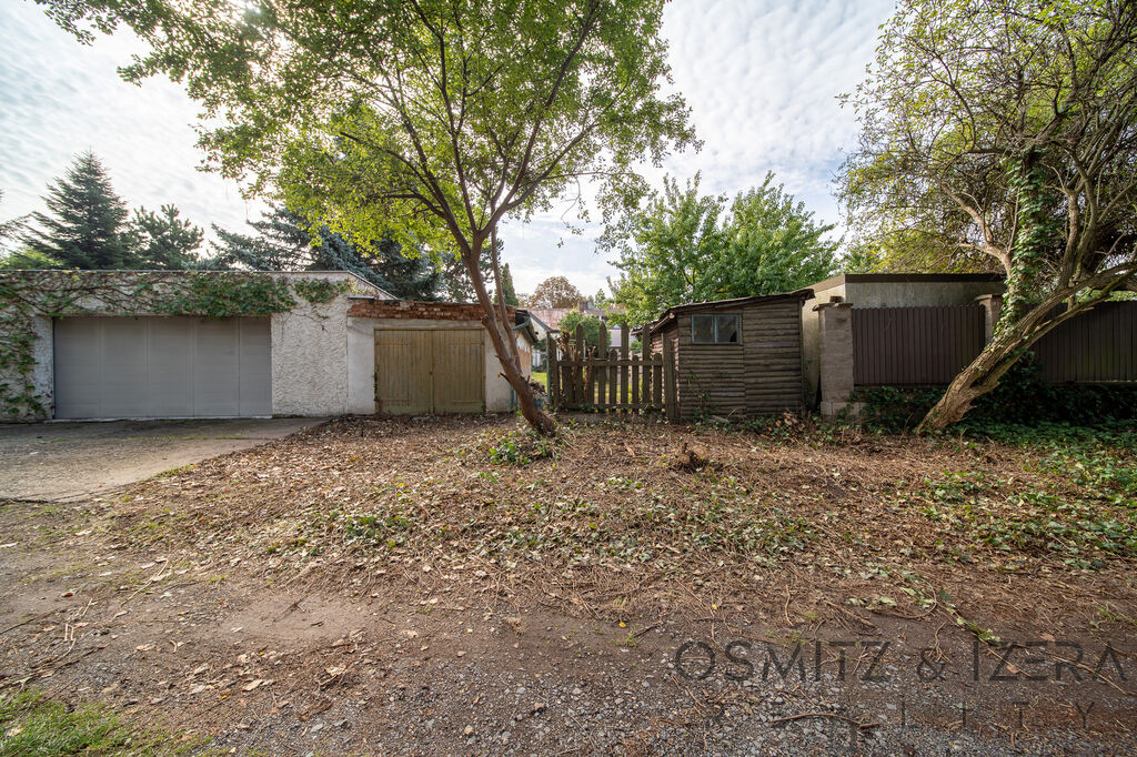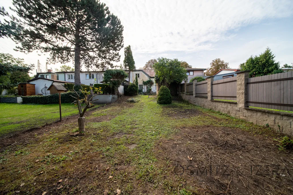 Před domem se nachází malá předzahrádka o ploše cca 36 m² a za domem se rozprostírá velká zahrada s výměrou 327 m², která je dobře přístupná a nabízí příjemné místo pro relaxaci. Na zahradě je také garáž pro jeden automobil a menší zděná kůlna. Celková plocha pozemku činí 449 m², přičemž zastavěná plocha je zhruba 86 m². Podélný tvar zahrady a její orientace zaručuje téměř celodenní sluneční svit, což je ideální pro zahradničení, rodinné aktivity nebo třeba wellness zónu. Zahrada a garáž je přístupná i ze zadní části po asfaltové komunikaci což je veliký benefit.