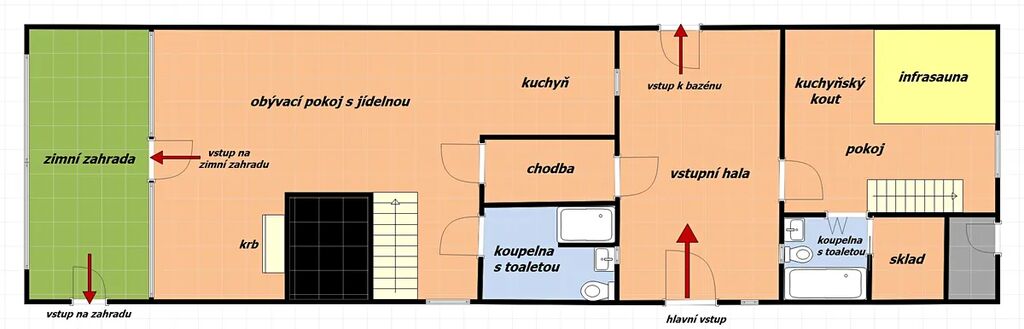 Exkluzivně Vám nabízím ke koupi kompletně zařízenou chalupu /rodinný dům s číslem popisným/ s dispozicí 5+1 se zimní zahradou a stodolou o celkové užitné ploše 236 m2, situovanou na překrásném a velice klidném pozemku o celkové výměře 5776 m2 s vlastní příjezdovou asfaltovou cestou, v malebné části obci Háje nad Jizerou, část Loukov. Součástí pozemku je tzv. Tvrziště Loukov, nacházející se na pahorku Karcák, nazývaná Hrádek. V současné době má dům 3 ložnice s 10 lůžky a v současné době je převážně využíván k celoročnímu pronájmu s ročním výnosem cca 500.000 Kč. Vytápění domu zajištuje tepelné čerpadlo vzduch – voda s rozvodem do soustavy radiátorů a dále klimatizační jednotka, která je umístěna v pravé části domu. V jarních a podzimních dnech si lze tepelnou pohodu zpříjemnit krbem. Celý dům je napojen na obecní vodovod, odpad sveden do septiku, elektřina 230/400 V, internet prostřednictvím pevné tel. linky. Součástí domu jsou 2 kuchyně, 2 koupelny s toaletami, v pravé části domu je k dispozici infrasauna pro 4 osoby. K domu dále přináleží stodola, kde je sklad dřeva a dále samostatná místnost se stolem na stolní tenis a šipkami, venku je k dispozici nadzemní bazén o průměru 3,6 m s hloubkou 1,2 m. Pro pohodu, relaxaci a sport lze využívat 4 relaxační lehátka, houpačku, venkovní posezení, volejbalové hřiště, basketbalový koš a otevřené ohniště. V obci se nachází základní škola, mateřská škola, obchod, obecní úřad, dopravní dostupnost do obce Háje nad Jizerou a Jilemnice zajištěna autobusem linky č. 962. V okruhu do 16 km se nachází několik známých sjezdových středisek /Vítkovice, Vrchlabí, Herlíkovice a Benecko, Špindlerův mlýn a Rokytnice nad Jizerou do 30 minut jízdy od domu/. Více informací nebo prohlídku si domluvte telefonicky.