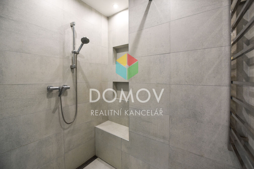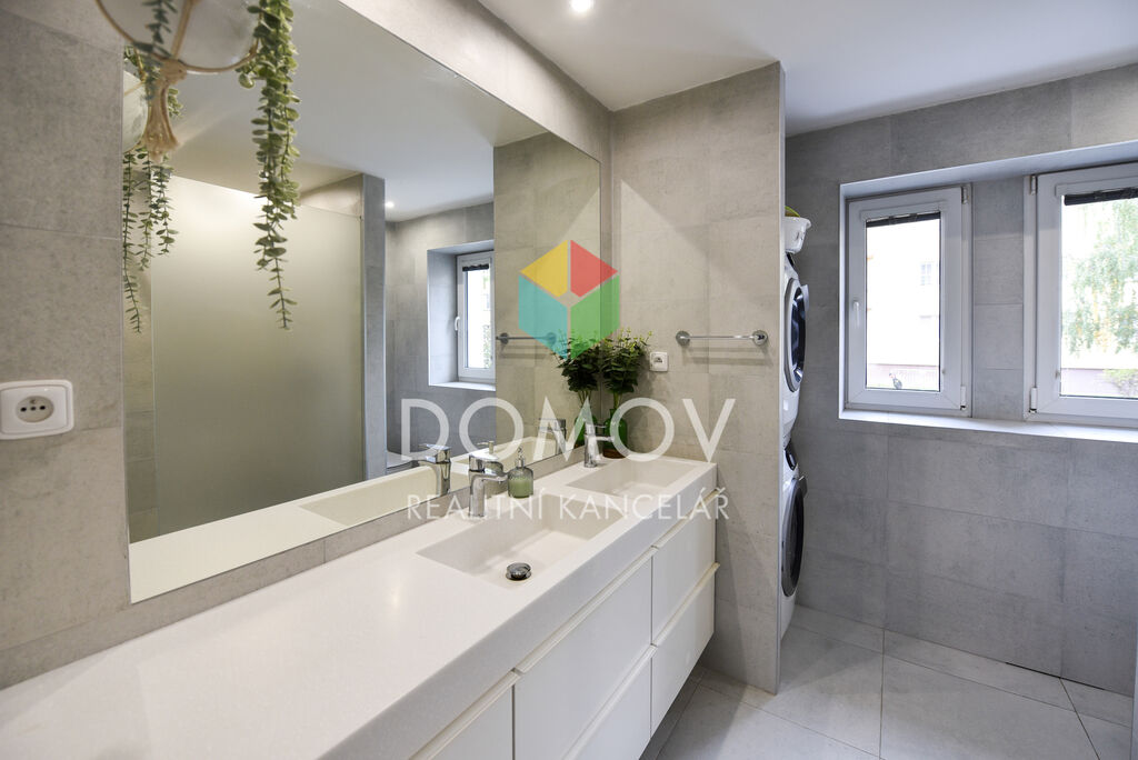 V koupelně se nachází moderní sprchový kout, dvouumyvadlo, toaleta a pračka.