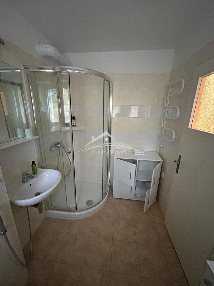 Dispozice zahrnuje zděné jádro s koupelnou vybavenou sprchovým koutem a splachovacím WC, komoru a sklepní kóji. Kuchyň je osazena zánovní linkou s vestavěnými spotřebiči – elektrickým sporákem, horkovzdušnou troubou a digestoří, dále je k dispozici pračka a lednice s mrazákem.