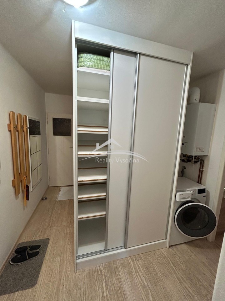 V ložnici se nachází manželská postel a skříně, v obývacím pokoji pak obývací stěna, rohová sedací souprava a konferenční stolek. Vytápění je zajištěno vlastním plynovým kotlem, který zároveň ohřívá teplou vodu.