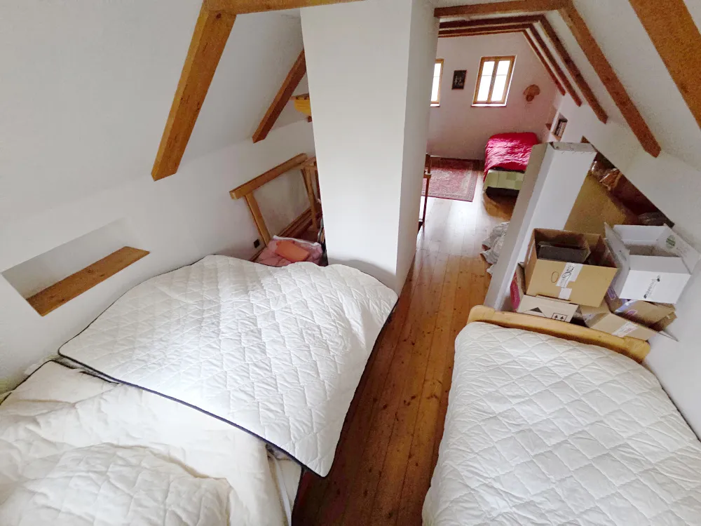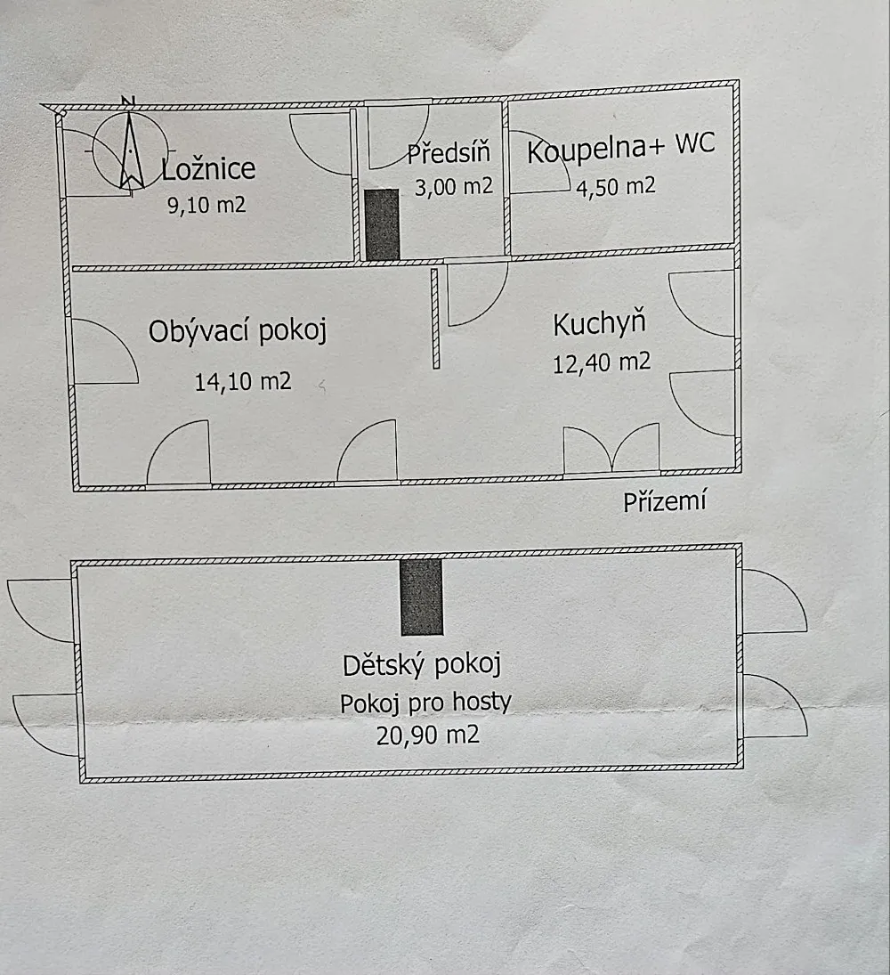 Dům je umístěn téměř ve středu pozemku. Jedná se o částečně podsklepenou zděnou stavbu o zastavěné ploše 64m2 s obytným podkrovím. V přízemí najdete pokoj s kuchyňským koutem, ložnici, koupelnu s WC a chodbu. Z chodby se po mlynářských schodech dostanete do obytného podkroví, které je tvořeno jedním pokojem o velikosti 20m2. Půda je zateplená a měla by tak být pohodlně obyvatelná i v letních měsících. Dům má zpracovaný PENB a je v kategorii D. Do sklepa se vchází z venku zvláštním vchodem. Dům má terasu přístupnou z obývacího pokoje a nově přistavěnou pergolu.