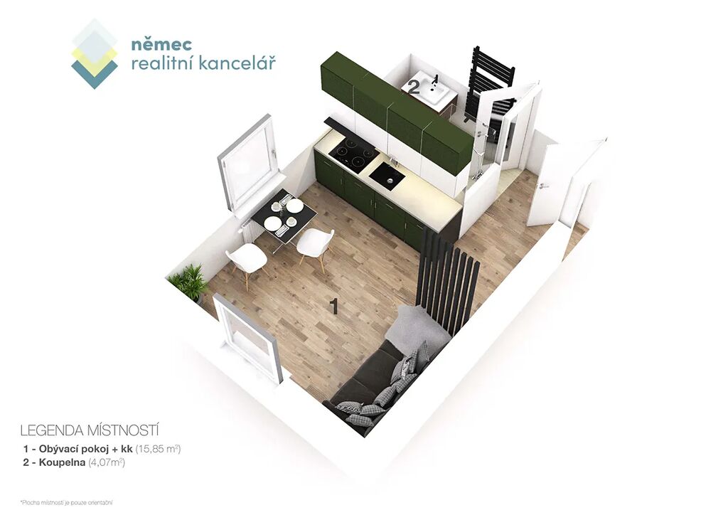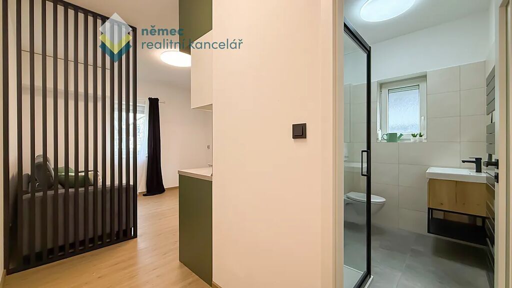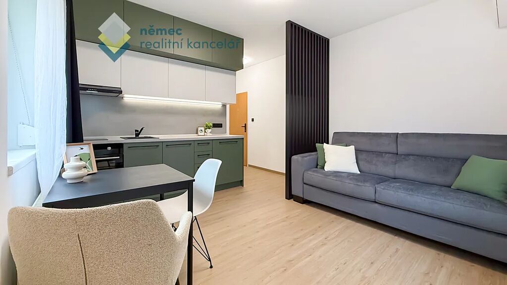 Jsou garsonky a garsonky. Troufáme si říct, že tohle je TA garsonka. Minimalistický design lahodící oku - na podlaze je rigidní vinylová podlaha v dekoru Oak, kvalitní kuchyň na míru od profesionálního truhlářského studia barevně kombinuje zelenou verde, bílou arctic a chromix stříbrnou. K tomu všemu černé doplňky, vestavné spotřebiče (hork. trouba, odsavač par, varná deska, lednice, příprava na myčku) a černý granitový dřez s baterií.