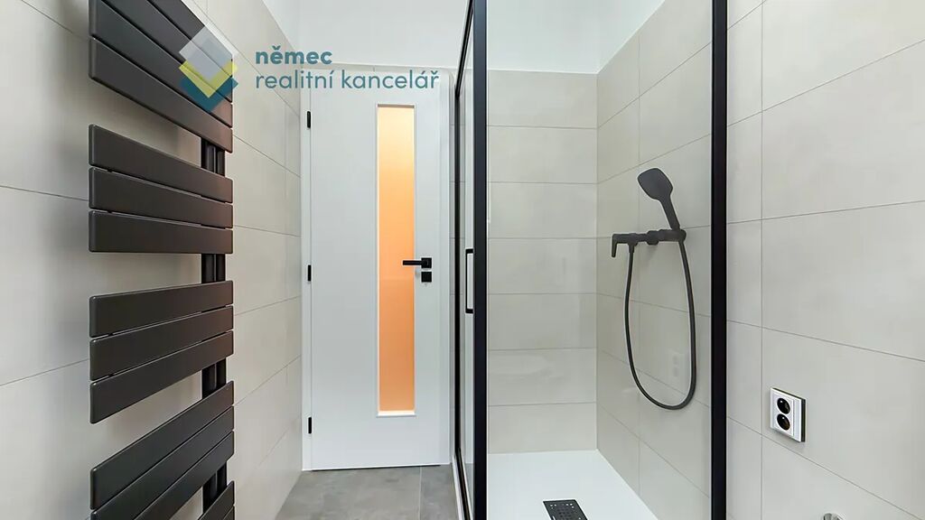 Koupelna je opět v decentní kombinaci šedé, černé, bílé a dřeva. Oceníte široký walk-in sprchový kout, závěsné wc, designové topidlo a prostor pro pračku.