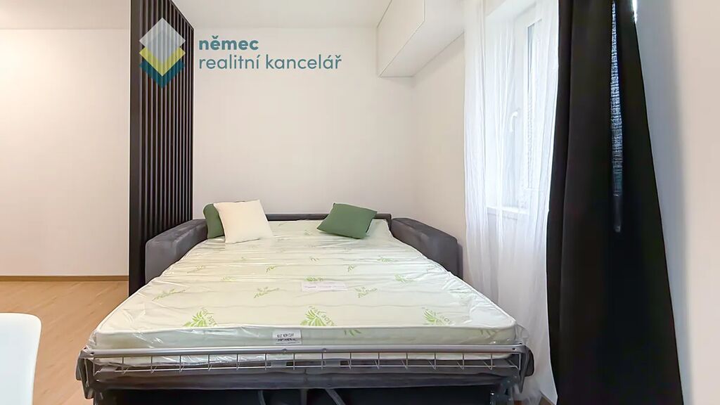 Prostor přepažuje lehká lamelová stěna oddělující spací část od té jídelní. Pohodlí vám či nájemci zajistí rozkládací pohovka s plnohodnotným lůžkem a matrací s aloe vera.