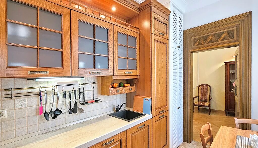 Interiér bytu je důkazem sofistikovaného architektonického přístupu, kde moderní design harmonicky splývá s autentickými prvkami, včetně precizně zpracovaných replik špaletových oken, dřevěných parapetů a pečlivě renovovaných dveří. Kompletní rekonstrukce bytu zahrnovala instalaci kvalitních dřevěných parket a keramické dlažby, na míru vyrobenou kuchyň s moderními spotřebiči, integrovanou pračkou a bezpečně umístěným plynovým kotlem.