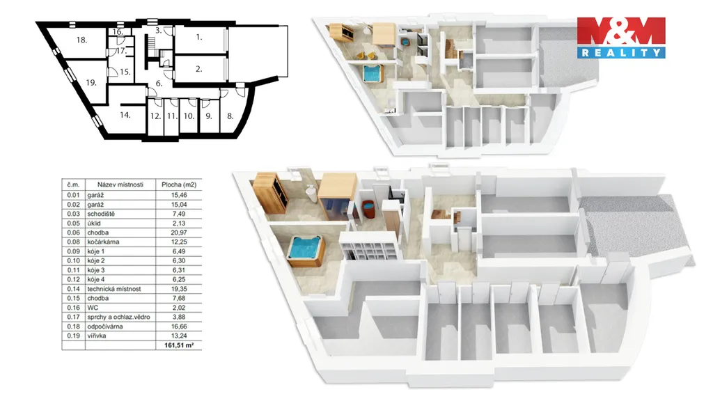 Celková plocha bytu činí 154 m² a doplňuje ji prostorná terasa 38 m², balkon 19 m² a sklepní kóje 6 m².