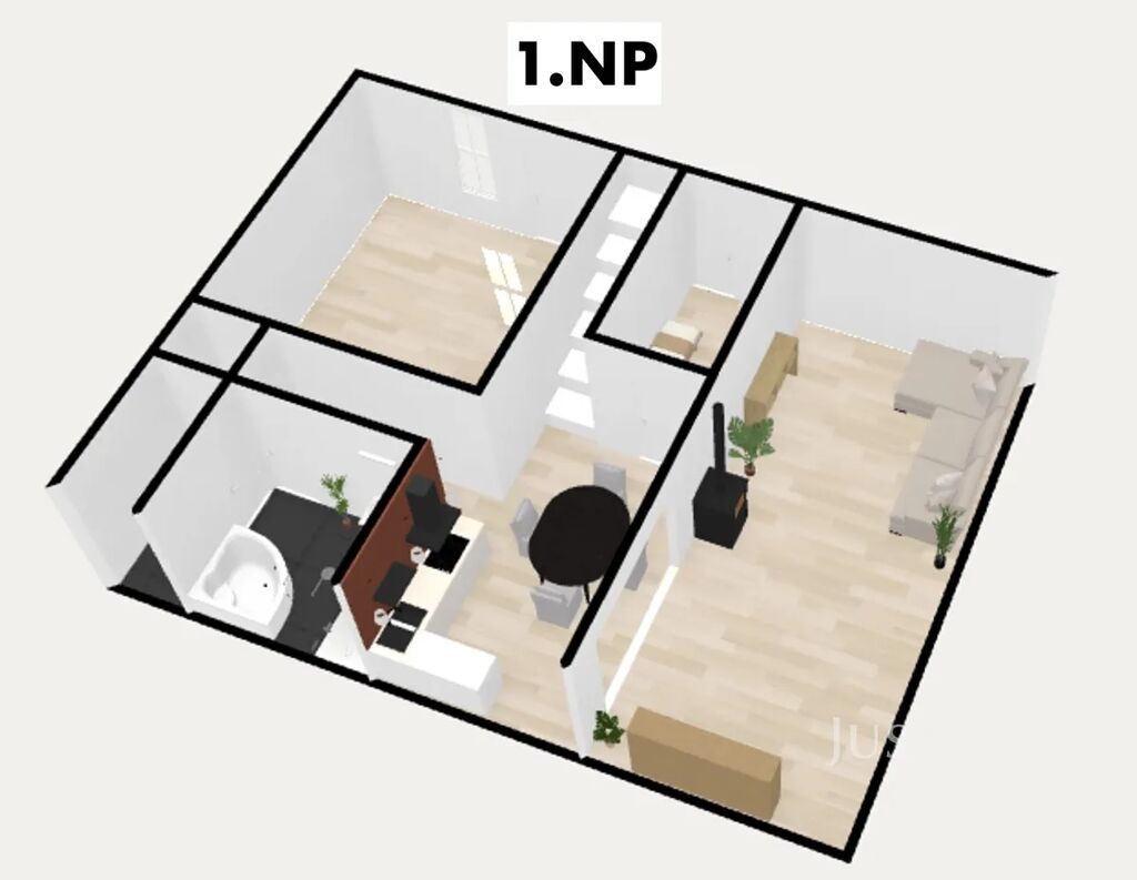 V zastoupení majitele nabízíme k prodeji rodinný dům ve stylu roubenky o dispozici 4+kk. V domě je ve velké míře použito dřevo, aby dům působil útulným dojmem. V přízemí domu se nachází předsíň, na kterou navazuje kuchyně propojená s obývacím pokojem. V obývacím pokoji jsou velká kachlová kamna, která navozují příjemnou a pohodovou atmosféru domu( majitelé si kamna sice odvezou, ale nový majitel si může vyřešit vytápění podle svých přestav.) Podlaha je z ošetřených borovicových prken a strop je obložen dřevem. Obývací pokoj přímo navazuje na kuchyni a tvoří jeden velký otevřený prostor, kdy může být celá rodina neustále v kontaktu.