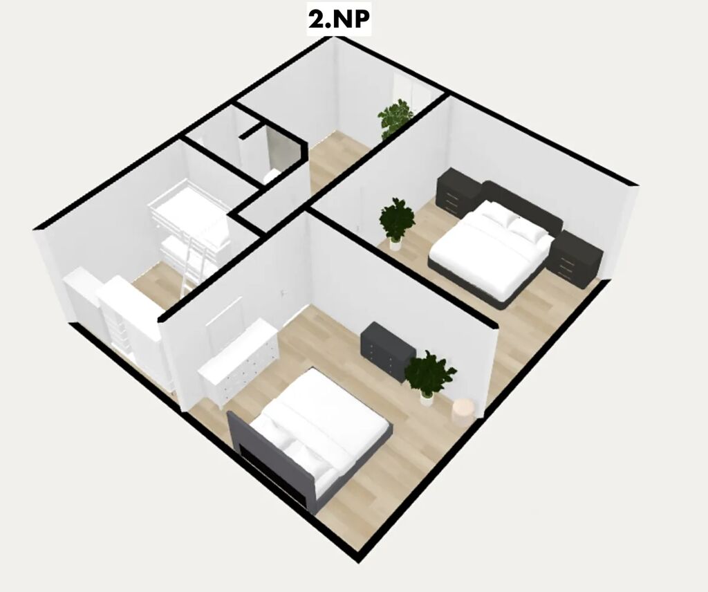V patře domu jsou 3 různě velké pokoje pro využití. V jednom z pokojů jsou vyvedeny odpady a voda, pokud by je nový majitel chtěl využít i v patře domu. Dále se zde nachází menší koupelna se sprchovým koutem, umyvadlem a toaletou.