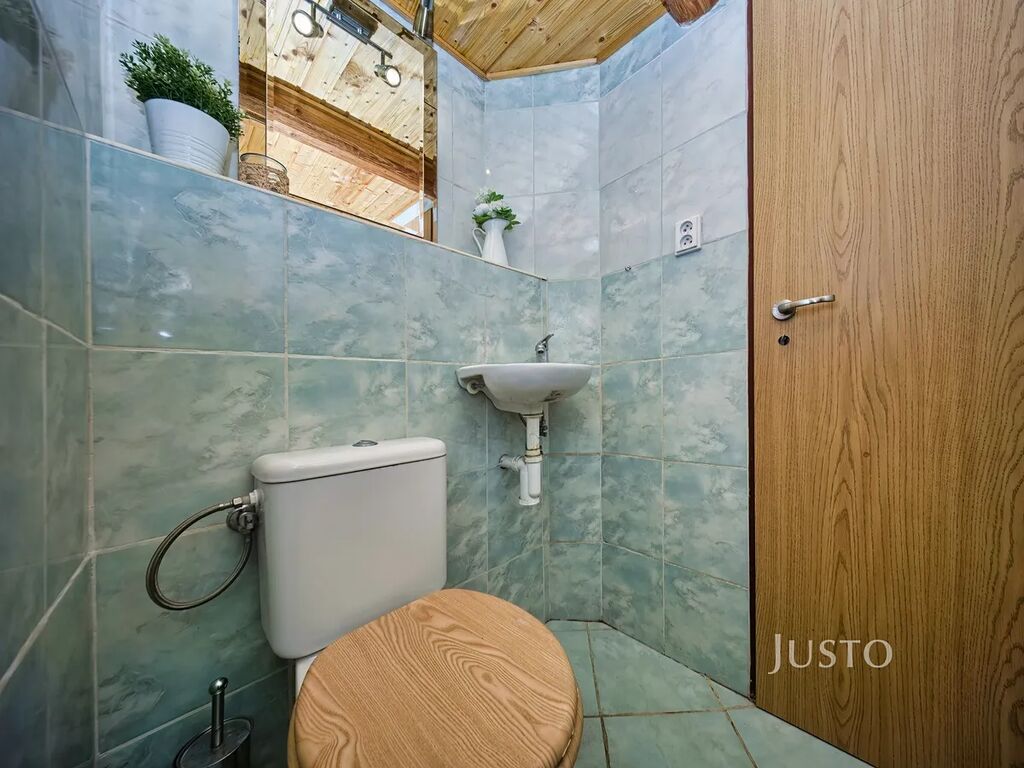 V přízemí domu je také koupelna, kde je vana i sprchový kout a umyvadlo. Toaleta je v přízemí řešena samostatně. Za koupelnou jsou i úložné prostory pro skladování potravin.