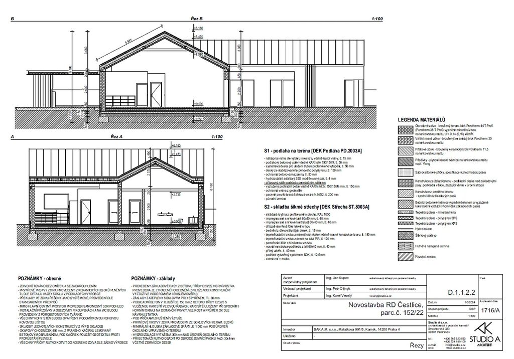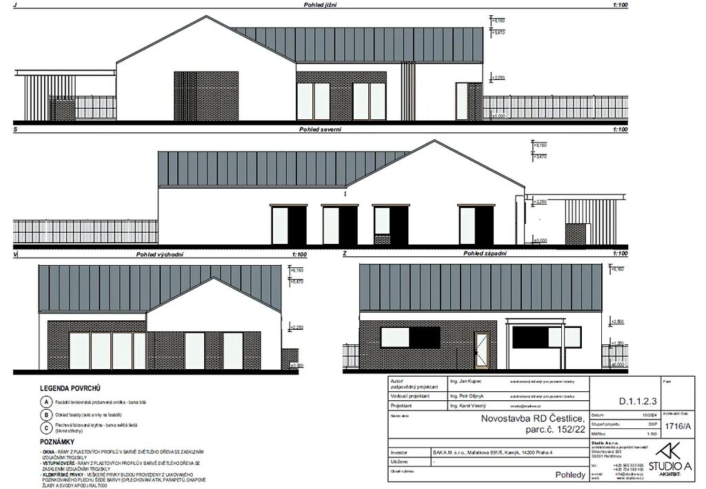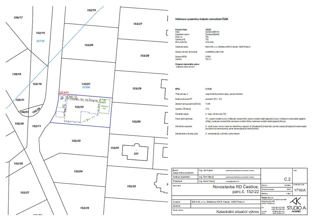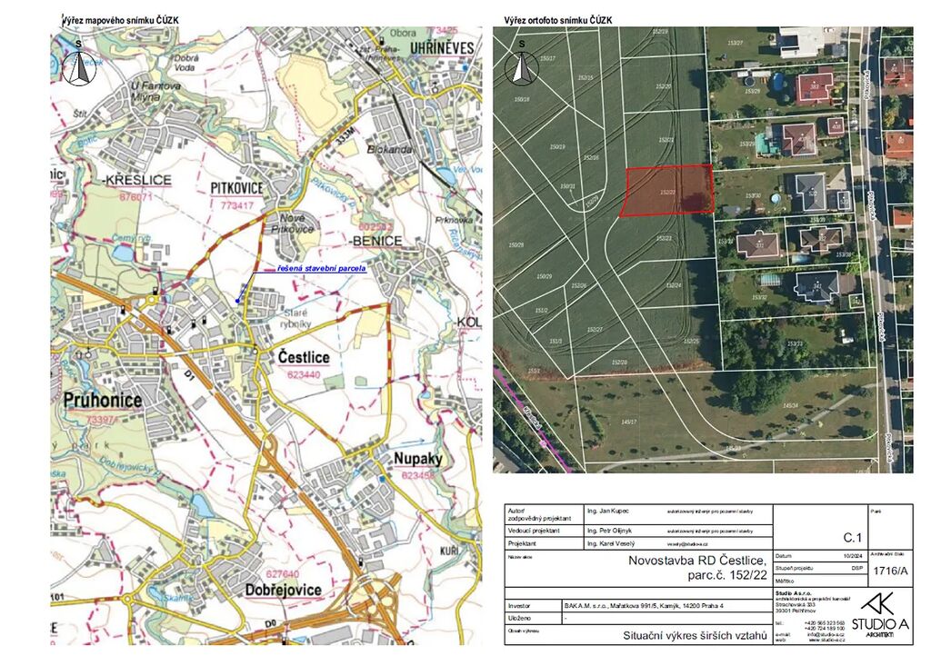 Předmětem prodeje je pozemek včetně kompletní projektové dokumentace a zajištěným stavebním povolením k výstavbě rodinného domu dispozice 5+kk se zastřešeným parkovacím stáním, vše na parcele číslo 152/22 v k.ú. Čestlice. Celková zastavěná plocha činí 249,3 m2 a celková užitná plocha 206,4 m2.