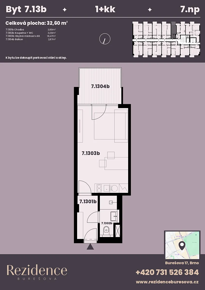 Nabízíme k prodeji moderní byt 1+kk o podlahové ploše 26,14 m2 s balkonem 6,46 m2 nacházející se v námi připravovaném projektu Rezidence Burešova v atraktivní lokalitě Veveří. Byt se nachází v 7.NP, orientace bytu do vnitrobloku, jižní strana. K bytu lze koupit parkovací místo v zakladači i sklep.