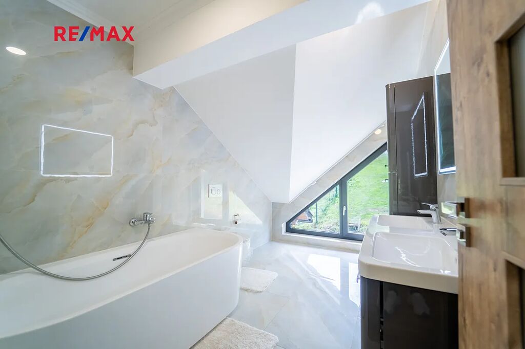 Ve druhém patře je prostorná pracovna, ložnice, 2 pokoje, 2 koupelny, 2 balkóny. Ve štítu je půda, kde je možné vybudovat další 2 místnosti, případně prostorný ateliér.
