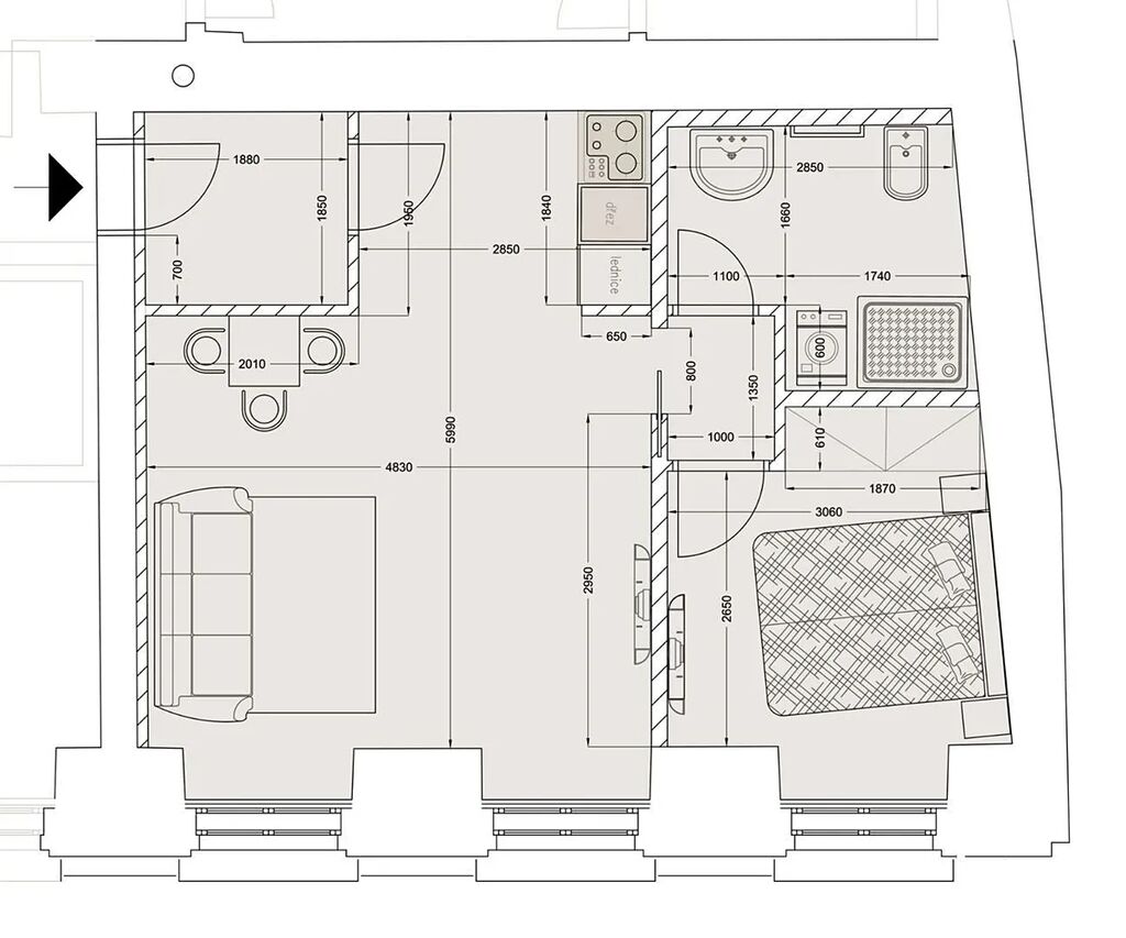 Zrekonstruovaný byt 2+kk (1 ložnice, 1 koupelna), o celkové obytné ploše 51,14 m2, je situován ve druhém patře historické budovy s výtahem, v prestižní lokalitě Staré Město na Praze 1, nedaleko Staroměstského náměstí, v ulici Kozí.