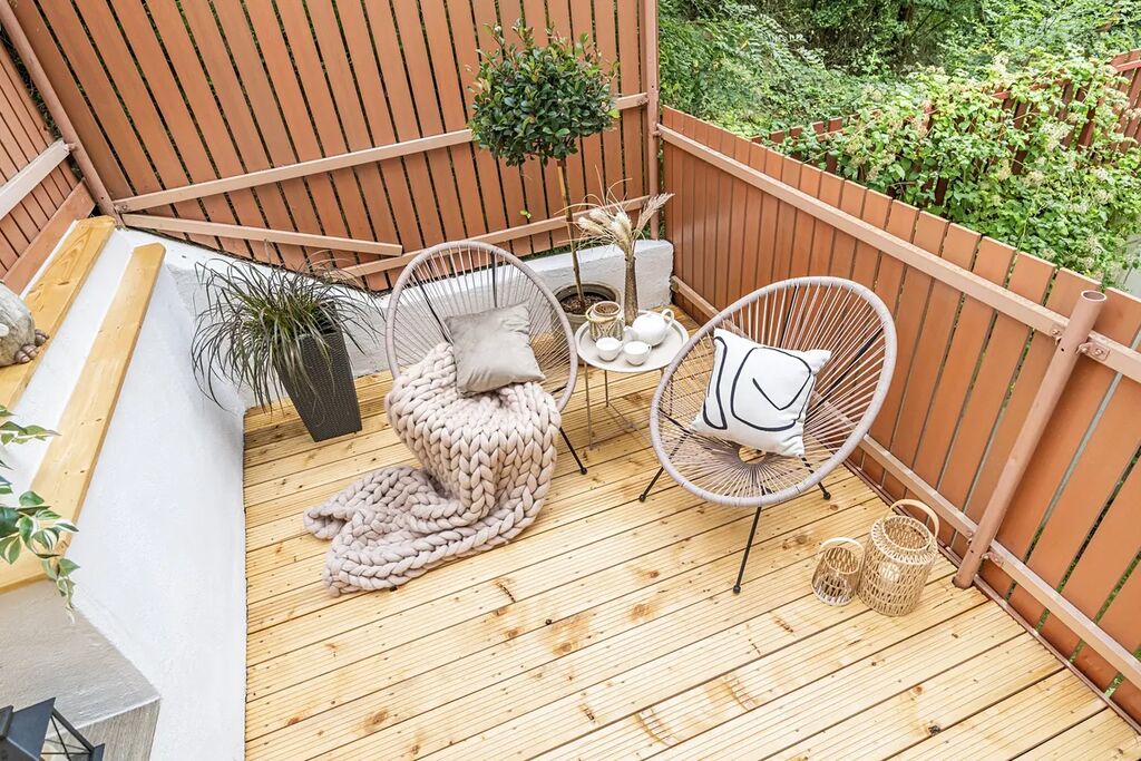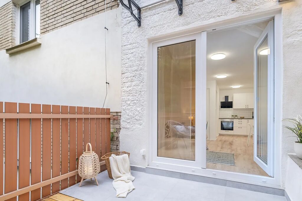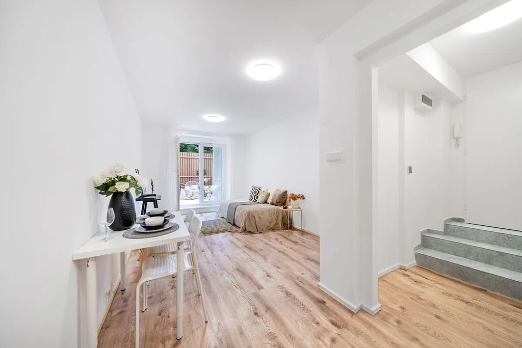 Velká francouzská okna zajišťují v celém interiéru dostatek přirozeného světla. Najdete zde kuchyňský kout s moderní linkou, podlahové topení a vstup na krásnou terasu. Ta je částečně obklopena vzrostlou zelení a poskytuje dostatek soukromí. Do koupelny se sprchovým koutem vstupujete z předsíně. Byt se prodává nezařízený. Můžete si ho tak upravit podle vlastních představ.