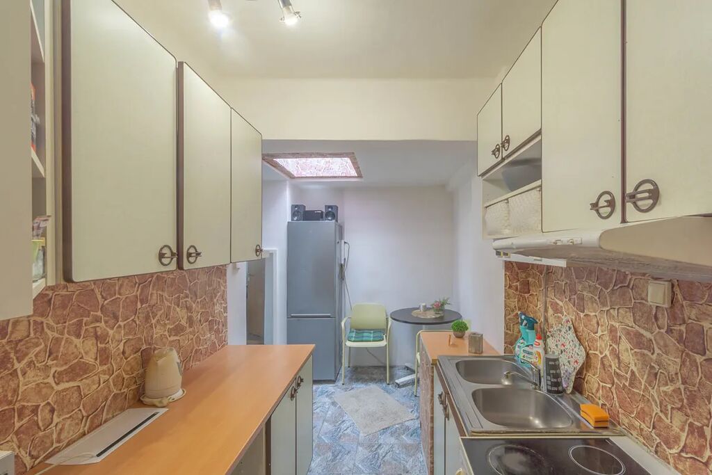 Hlavní bytová jednotka je prostornější a její dispozice zahrnuje předsíň (4,8 m²), kuchyni (15,2 m²), ložnici (20,1 m²), chodbu (7,4 m²), pokoj (19,4 m²), koupelnu (5,3 m²) a samostatné WC (1,1 m²). Dohromady 73,3m2.