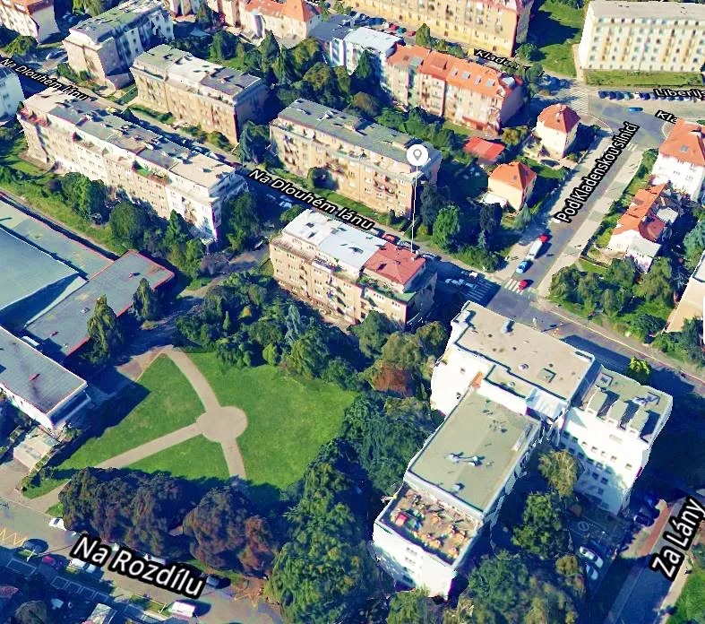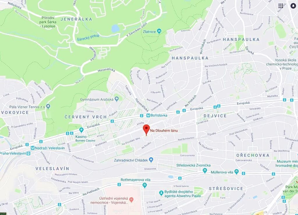 Byt se nachází ve 4. NP, v klidné ulici Na dlouhém lánu v Praze 6, kousek od stanice metra A – Bořislavka. V domě není výtah..
