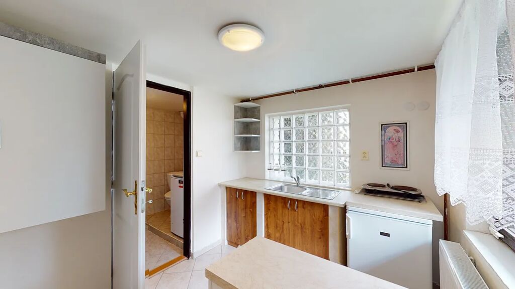 Ve zvýšeném přízemí najdeme obývací pokoj, ložnici, kuchyni, koupelnu se sprchou a WC. Kuchyňská linka je doplněna plynovým sporákem s troubou, chladničkou.