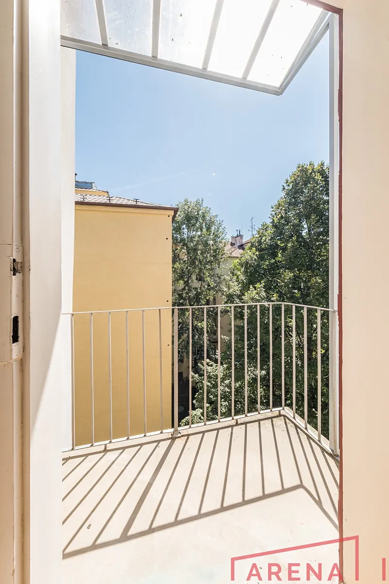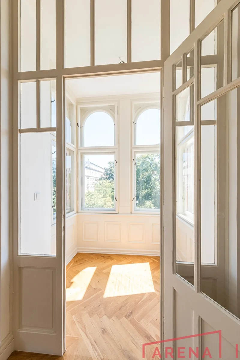Byt zaujme elegantním interiérem s původními architektonickými detaily, vysokými stropy a kvalitními materiály.