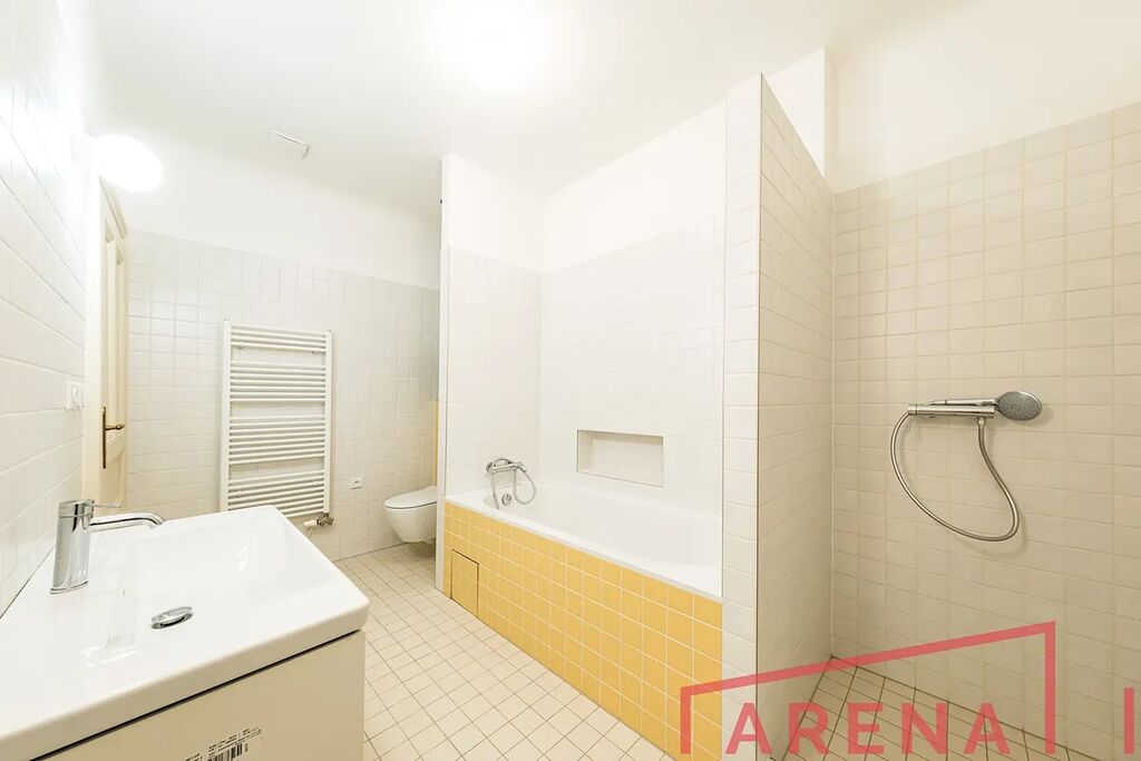 - moderní koupelna s vanou, sprchovým koutem a přípravou pro pračku