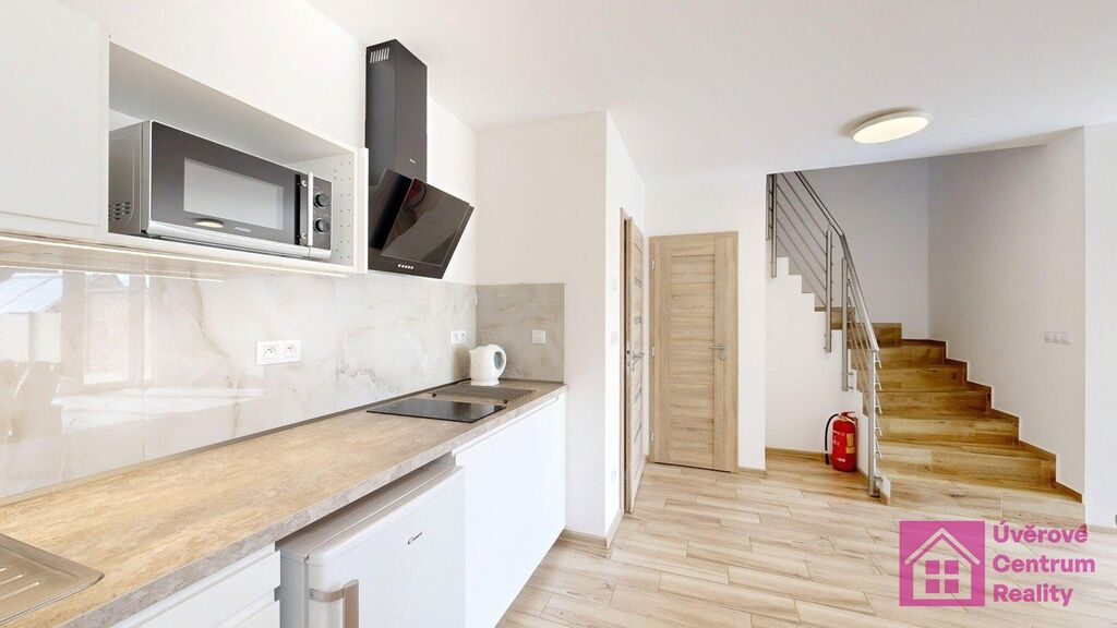 přízemí: předsíň, koupelna (sprchový kout), toaleta, pokoj s kuch. Koutem, schodiště a terasa.