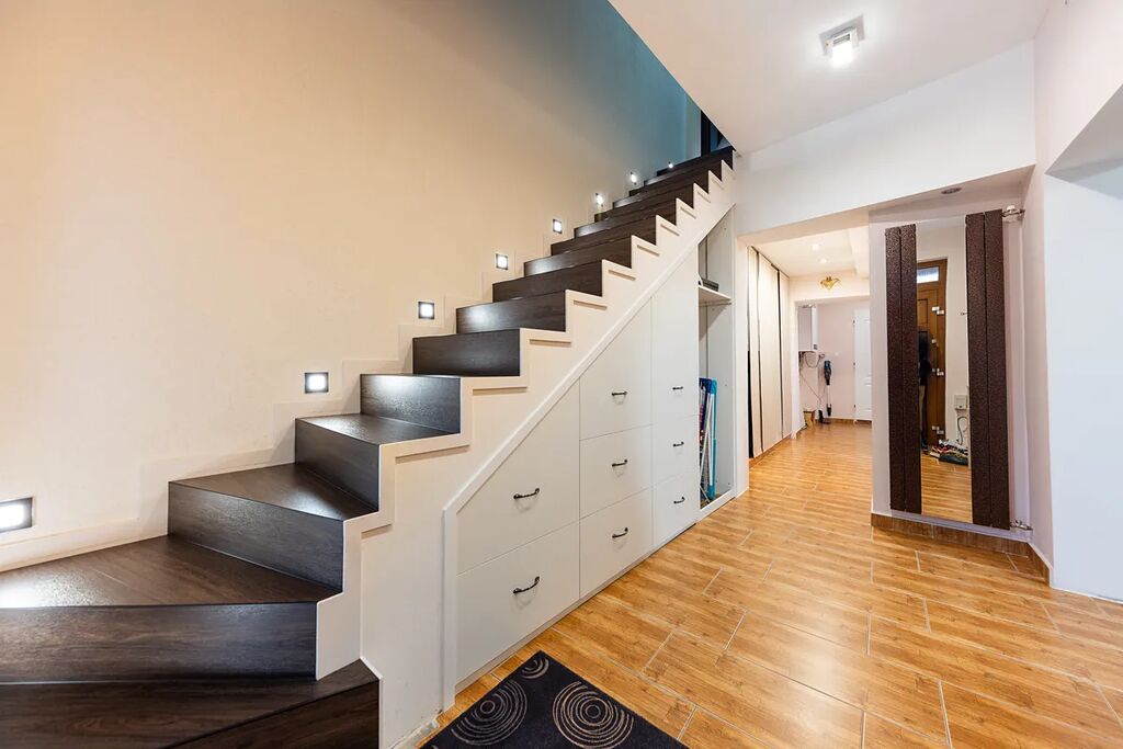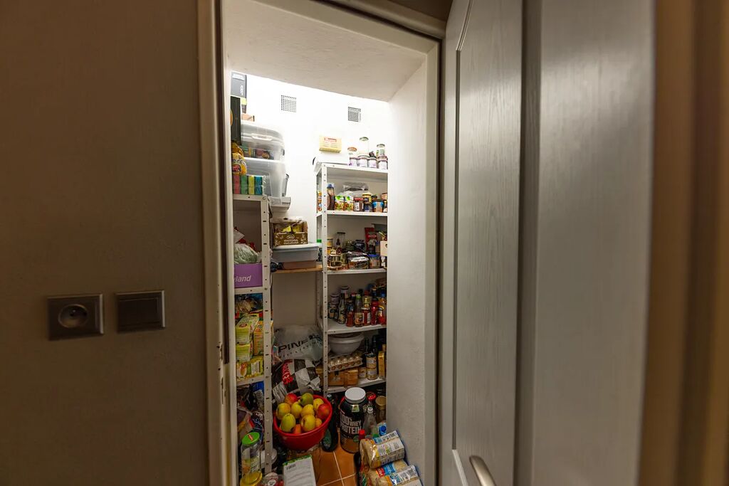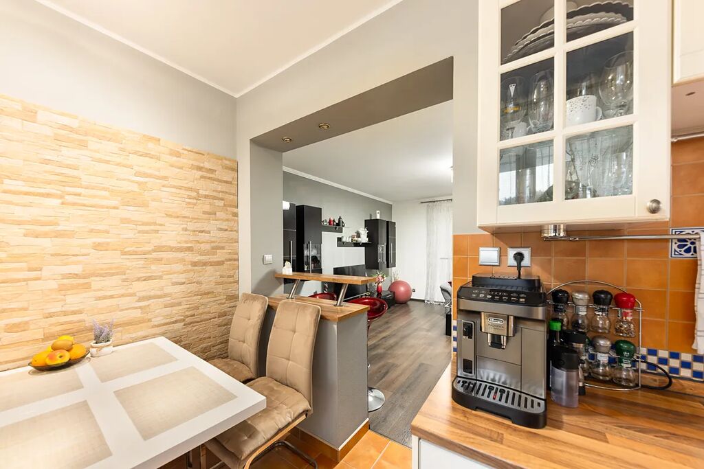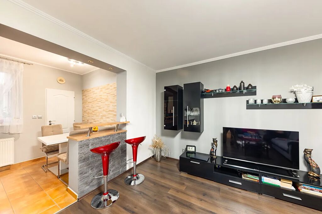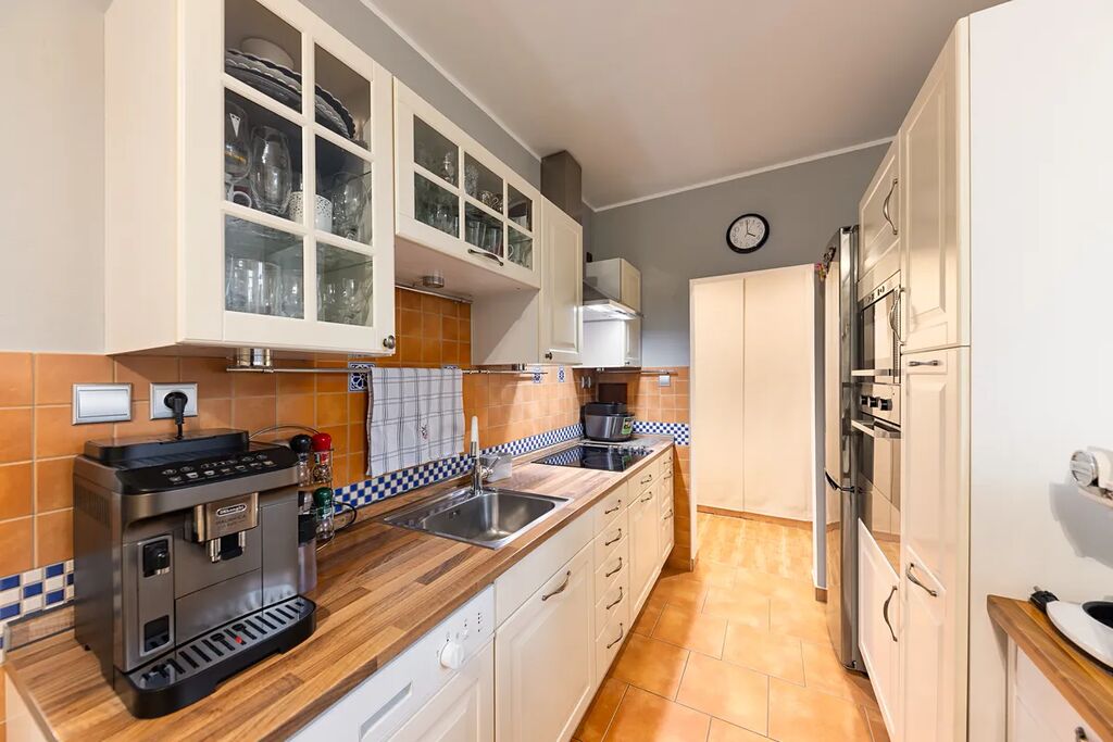 V přízemí se nachází prostorná vstupní chodba s množstvím úložných prostor, odkud je přístup do obývacího pokoje, kuchyně, koupelny, komory a na dvůr. Kuchyně je vyrobena na míru a vybavena vestavěnými spotřebiči – sklo-keramickou deskou, mikrovlnnou i horkovzdušnou troubou, myčkou, digestoří s uhlíkovým filtrem a lednicí s mrazicím boxem. Stylový jídelní kout s barovým pultem a kamenným obkladem plynule navazuje na obývací pokoj, kde elektrický krb vytváří příjemnou atmosféru, ideální pro podzimní i zimní večery.