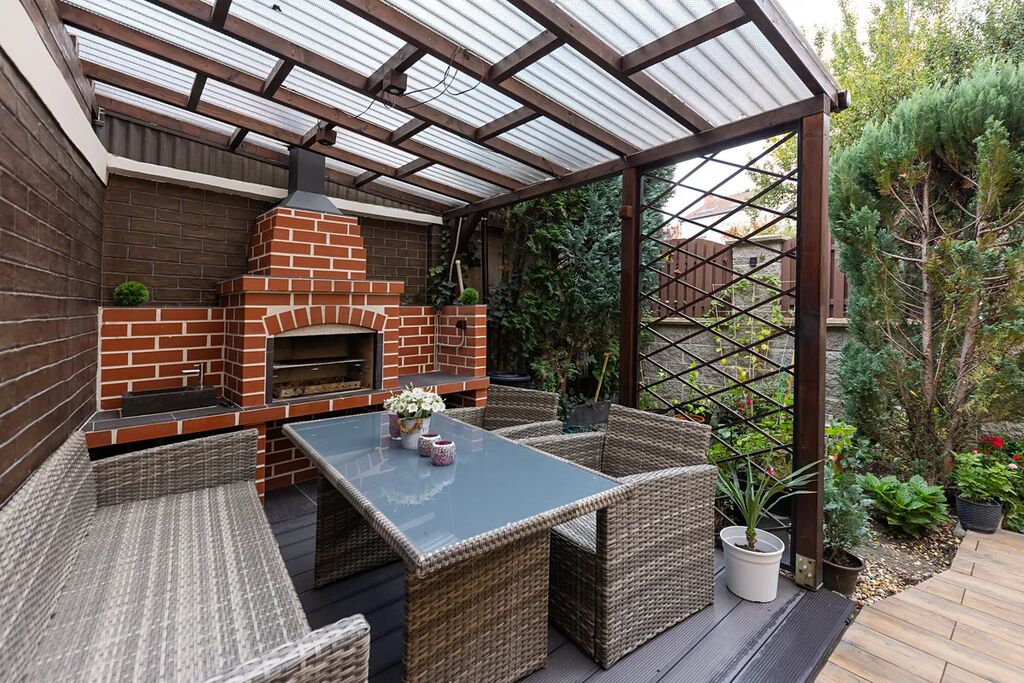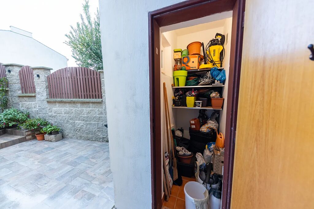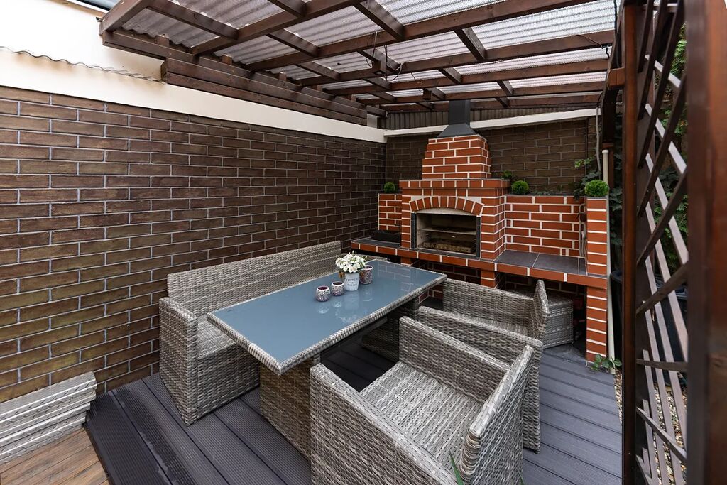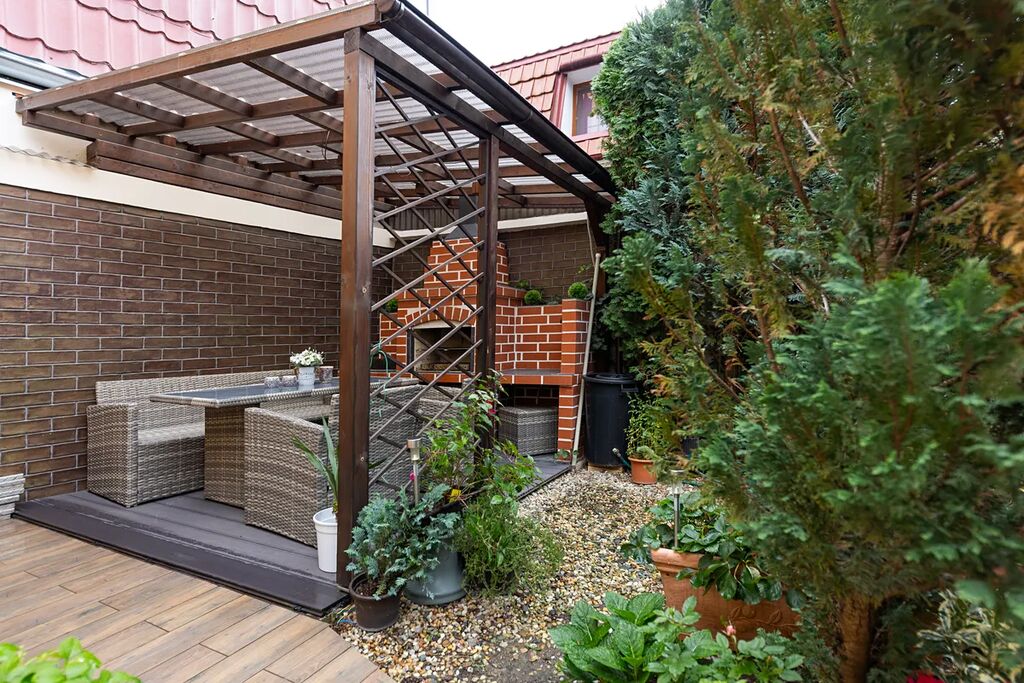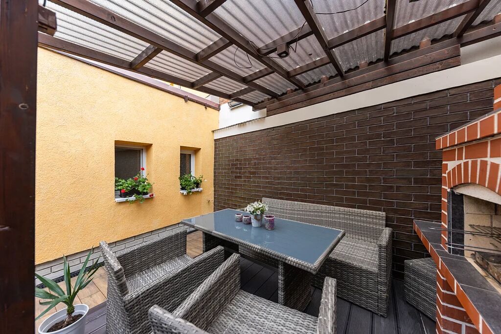 Dvorní trakt je navržený tak, aby poskytoval maximální soukromí a klid. Zastřešené posezení s krbem a grilem, obklopené zelení a květinami, vytváří ideální prostor pro odpočinek i rodinná setkání. Součástí dvora je také praktická venkovní místnost vhodná pro uložení kol nebo sezónních věcí.