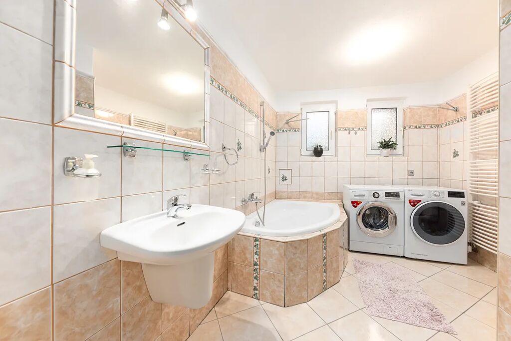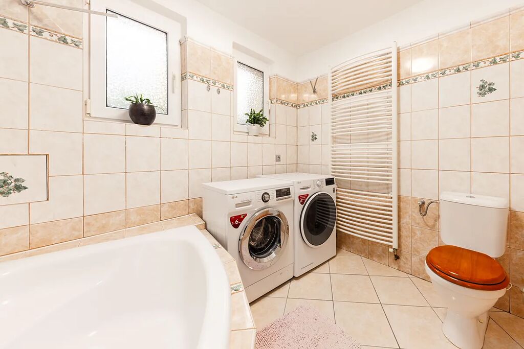 Koupelna v přízemí je prostorná, vybavená vanou, umyvadlem, WC a topným žebříkem, který lze vytápět plynem i elektřinou. Díky dvěma oknům je zde přirozené větrání. Součástí koupelny jsou také pračka a sušička.