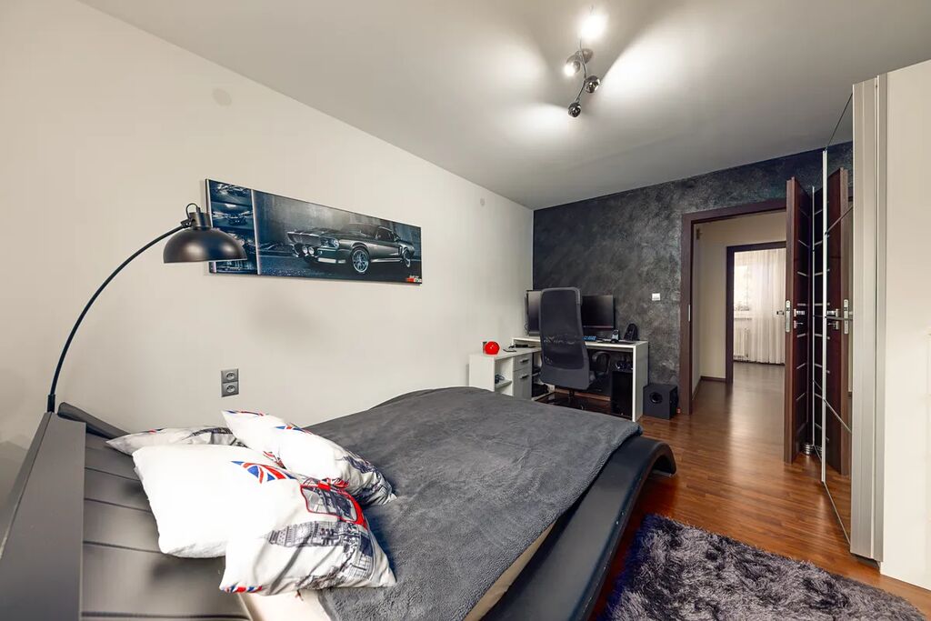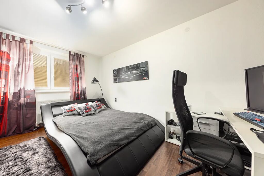 V patře se nacházejí tři pokoje využívané jako ložnice a dětské pokoje. Z jednoho dětského pokoje je vstup na terasu o výměře 11 m², která nabízí příjemné soukromí. K dispozici je i samostatné WC s umyvadlem. Nad obytným patrem je rozlehlý půdní prostor, vhodný například pro ateliér či domácí pracovnu.