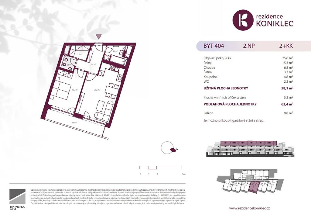 Jednotka č.404 má podlahovou plochu 63,4 m2 a disponuje obývacím pokojem s kuchyňským koutem (25,6 m2), ložnicí (15,3 m2), šatnou (3,3 m2) chodbou (6,8m2), koupelnou s WC (4,8m2).