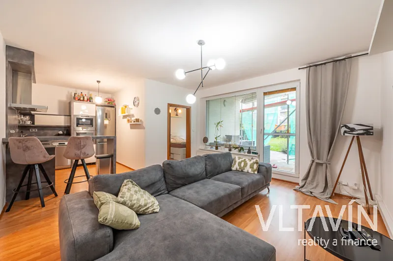 Plně zařízený byt sestává ze vstupní chodby, obývacího pokoje s kuchyňským koutem a se vstupem na jihozápadně orientovanou terasu (25 m2) s markýzou a následnou předzahrádku o velikosti 88 m2. Bytová jednotka je dále tvořena ložnicí, koupelnou s vanou a toaletou a praktickou šatnou s vestavěnými úložnými prostory.