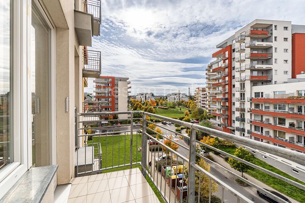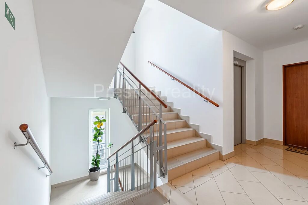 Bytu dominuje hlavní obývací pokoj s kuchyňským koutem (30 m2). Moderní kuchyňská linka je plně vybavena (elektrická trouba, mikrovlnná trouba, sklokeramická varná deska, lednice mrazák). Z obývacího pokoje je vstup na větší balkón (3,5 m2). V další části bytu se nachází dva samostatné pokoje (11 a 12 m2), přičemž jeden z nich má vlastní menší balkón (2 m2). V prostorné koupelně (5 m2) s rohovou vanou je prostor pro umístění standardně velké pračky (šíře 60 cm). WC zvlášť. K dispozici je také praktická komora v bytě (2,3 m2) a velký sklep u garážového stání ve třetím podzemním podlaží. Garáž o ploše 19 m2 má rozměry 2,87 x 6,67 m, přičemž vjezd je vrata umožňují vjezd pro vozidla o maximální šířce 2,24 m a výšce 1,94 m. Velkokapacitní sklep má plochu 10 m2 a rozměry 5,6 x 1,7 m. Pár kroků od vstupních dveří od domu je k dispozici praktická kočárkárna.