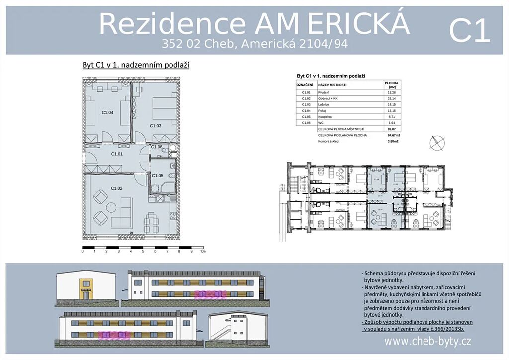 Byt C1 se nachází v 1. nadzemním podlaží bytového domu Residence Americká v Chebu. Nabízí velkorysé a světlé bydlení o dispozici 3+kk s celkovou podlahovou plochou 94,67 m², včetně sklepní komory (3,88 m²).