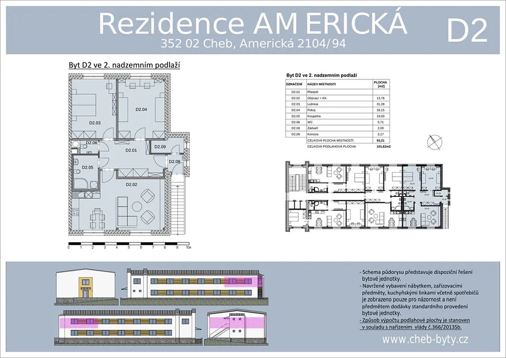 Byt D2 se nachází ve 2. nadzemním podlaží bytového domu Residence Americká v Chebu. Nabízí moderní, prostorné a světlé bydlení o dispozici 3+kk s celkovou podlahovou plochou 101,62 m².
