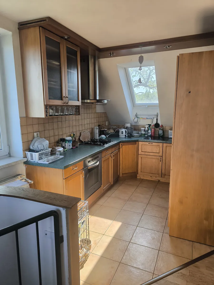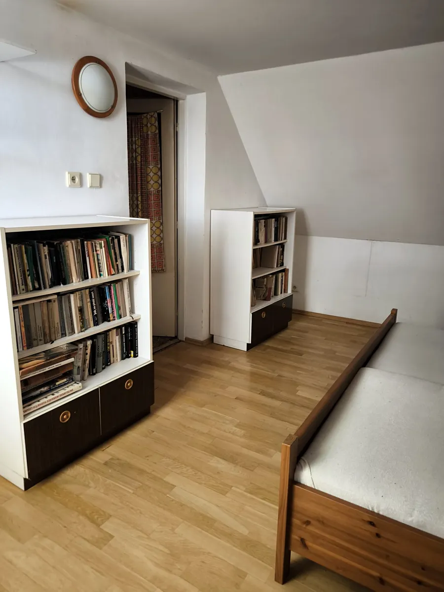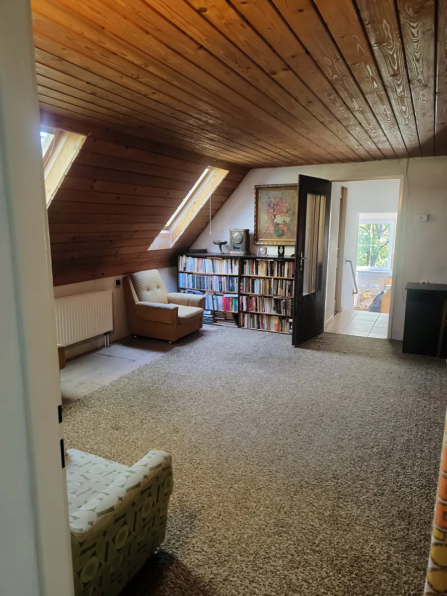 Za zádveřím jsou točité schody, které vedou do 2.NP, kde se nachází obytná místnost s kuchyňskou linkou, koupelna s wc a vanou, 2 komory a v půdním prostoru nad dílnou jsou dva průchozí pokoje se střešními okny pod sedlovou střechou.