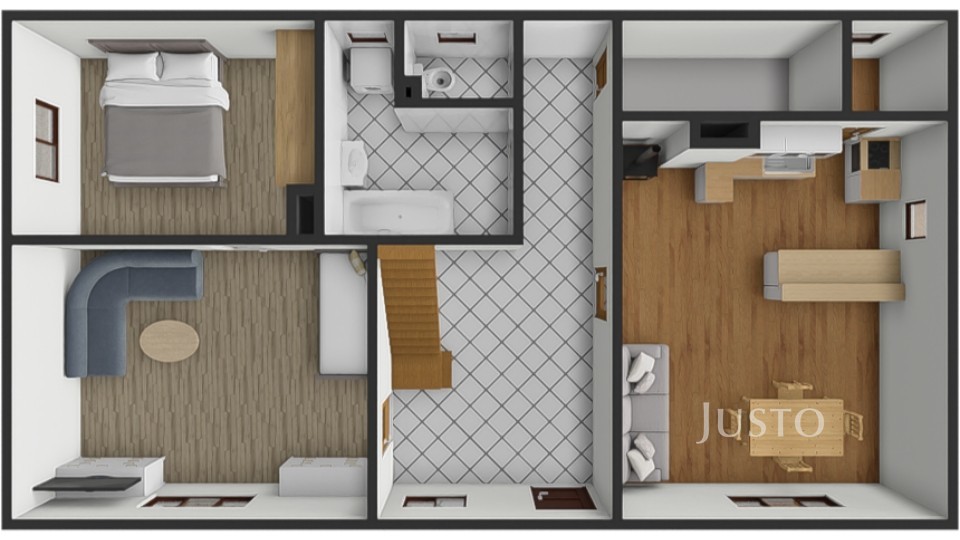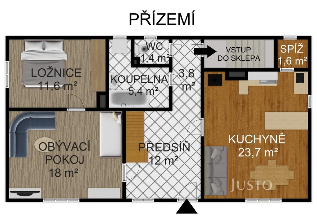 Vstupní hala působí vzdušně a prostorně. Na pravé straně domu se nachází obytná kuchyně se spíží, na levé straně obývací pokoj a ložnice.
