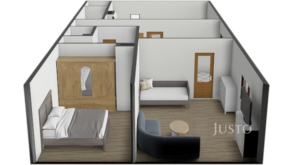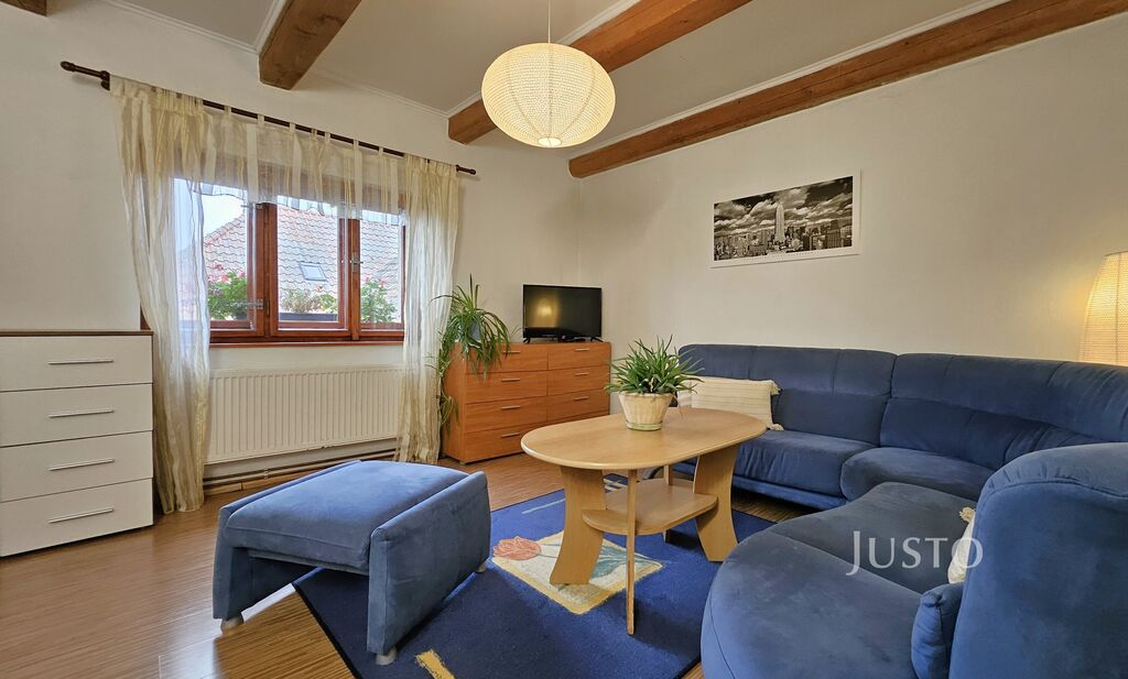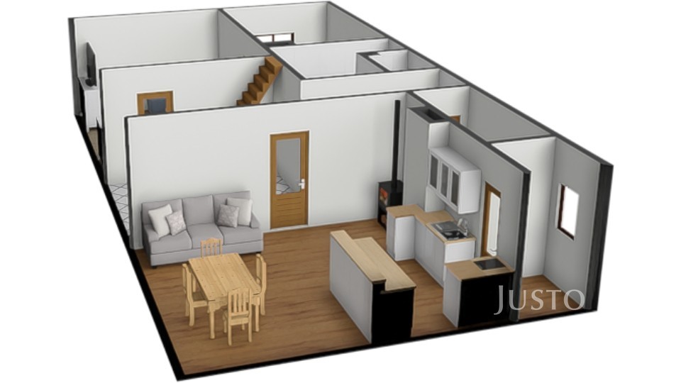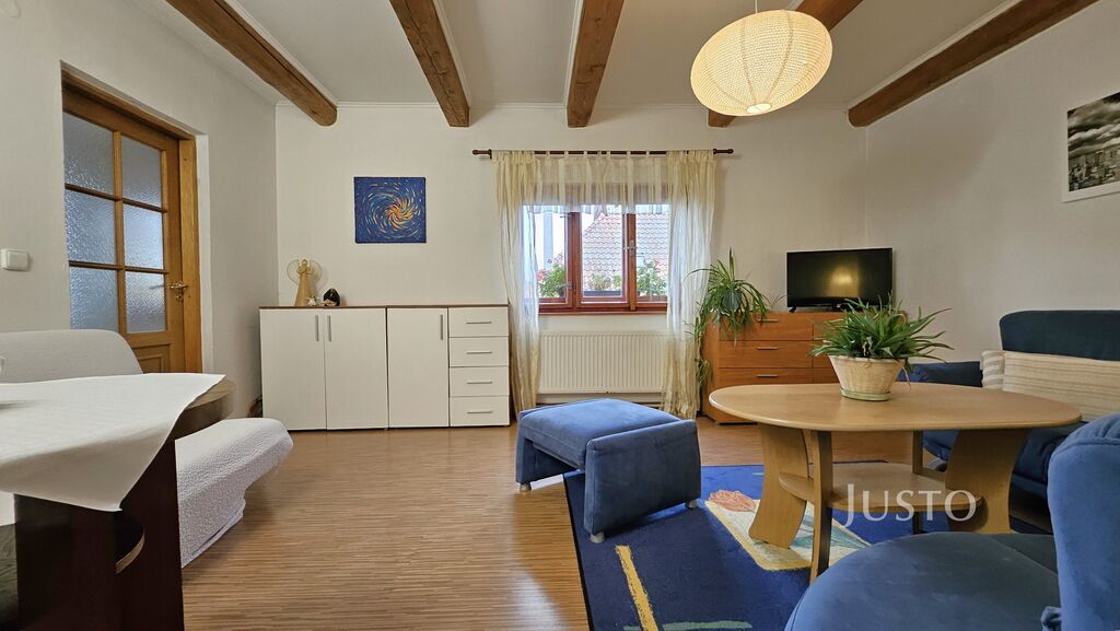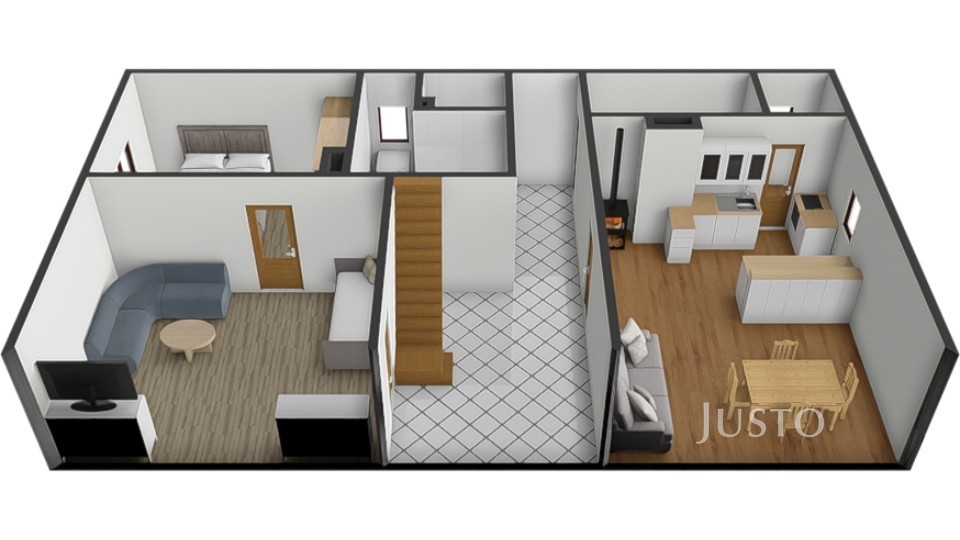 V obývacím pokoji jsou krbová kamna. V podkroví jsou situovány dva samostatné pokoje a volný půdní prostor s možností dalšího rozšíření.