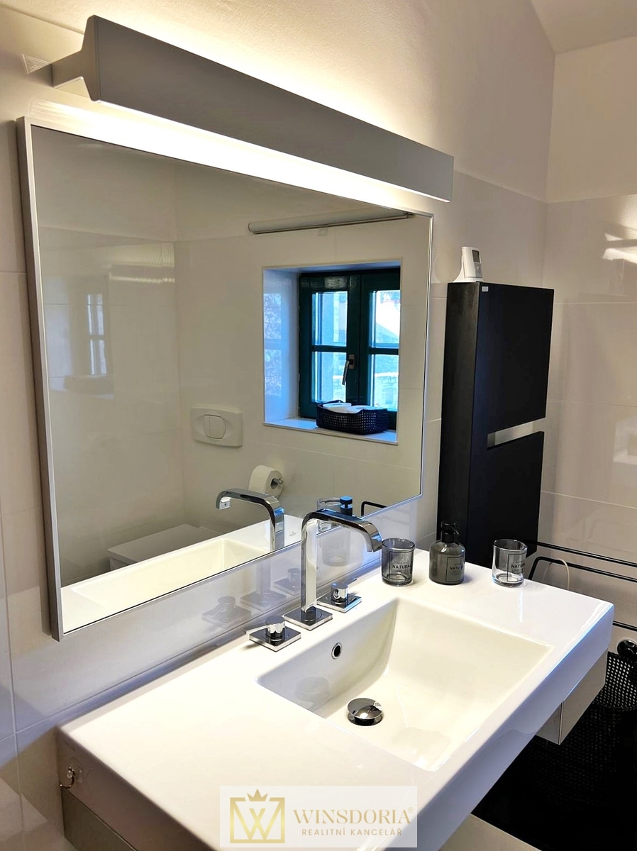 Z obývacího pokoje i z hlavní ložnice je přístup na prostornou terasou s vyhřívaným bazénem, ideálním místem pro odpočinek a posezení s výhledem do zeleně.