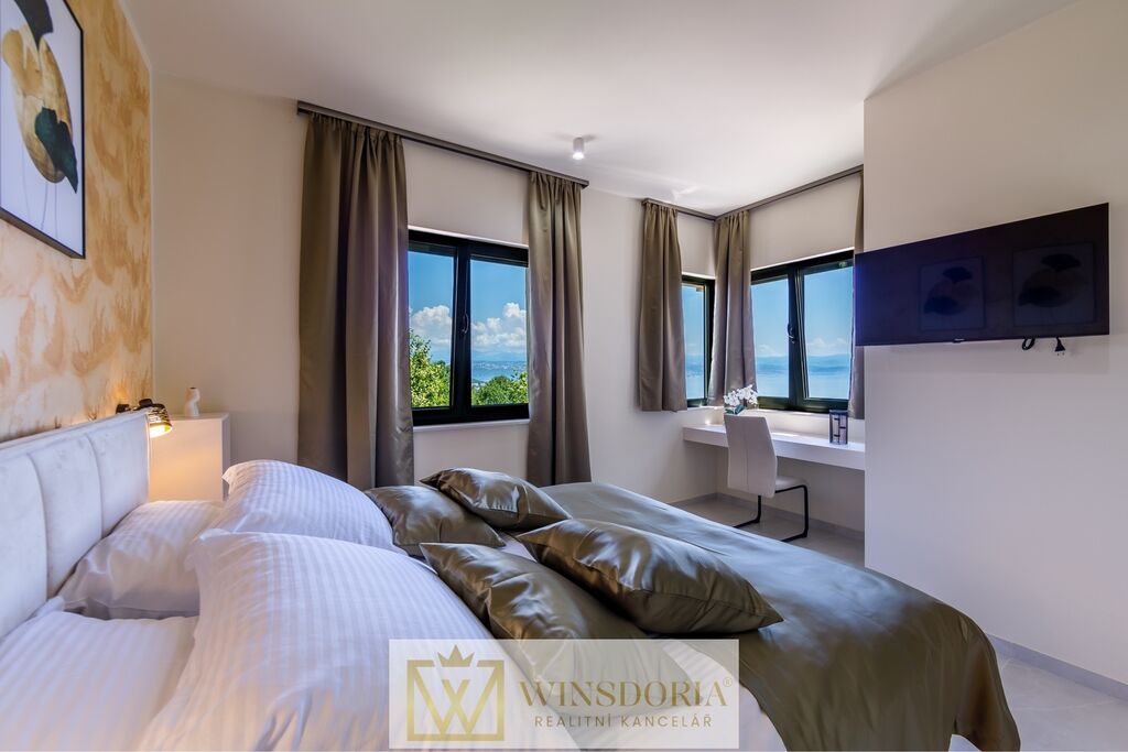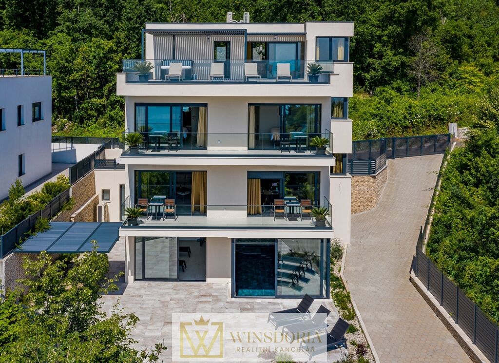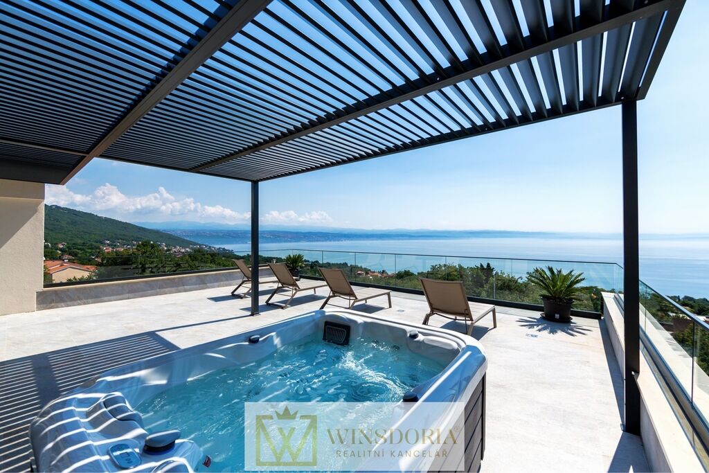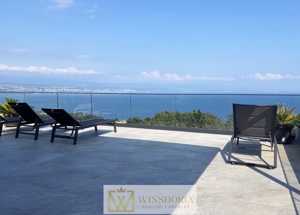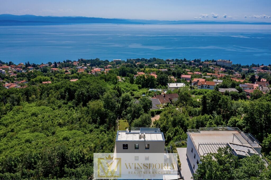 V klidné lokalitě Oprić, nedaleko Lovranu a Opatije, se nabízí k prodeji exkluzivní samostatně stojící vila moderní architektury s vyhřívaným krytým bazénem a panoramatickým výhledem na celý Kvarnerský záliv.